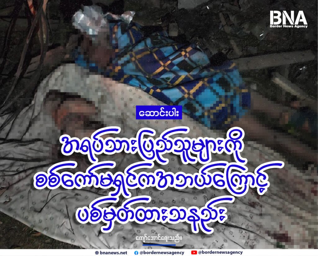 Read moreBorder News Agencyကျောက်ဖြူ၊ ဇန်နဝါရီ ၁၈။ ကျောက်ဖြူမြို့နယ်ထဲက စစ်ဘေးရှောင်တွေခိုလှုံနေတဲ့နေရာကို ဇန်နဝါရီလ ၁၈ ရက်၊ ညအချိန်မှာစစ်ကော်မရှင်တပ်လေကြောင်း၊ လက်နက်ကြီးတွေနဲ့ပစ်ခတ်တိုက်ခိုက်လို့ အမျိုးသမီးနှစ်ဦးသေဆုံးသွားတယ်လို့ ဒေသခံတွေကဆိုကြပါတယ်။ အဲဒီ ကျောက်ဖြူမြို့နယ်၊ ကျောက်ကလေးကျေးရွာအနီး ကမ်းခြေဖက်ကို စစ်ကော်မရှင်တပ်က လေကြောင်းမှဗုံးနှစ်လုံးနဲ့...
