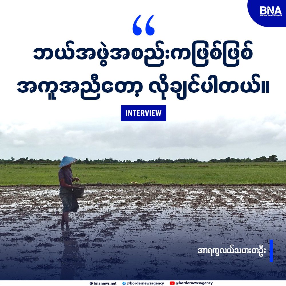 “စပါးပျိုးကြဲထားပါတယ်။ပျိုးမစိုက်ဘူးဆိုတာကလည်း ပျိုးစိုက်ဖို့အတွက် ပျိုးသားချထားတယ်။ လေးဆယ့်ငါးရက်။ ပျိုးချထားတဲ့အတောအတွင်းမှာ ကျွန်တော်တို့က စောင့်ပြီးမနေနိုင်ပါဘူး။စားဝတ်နေရေးအတွက် အလုပ်ပြုတ်သွားပါတယ်။ပျိုးစိုက်မယ့်အချိန်ကာ လထဲမှာ နေ့ချင်းရက်ချင်းစိုက်ရပါတယ်။”