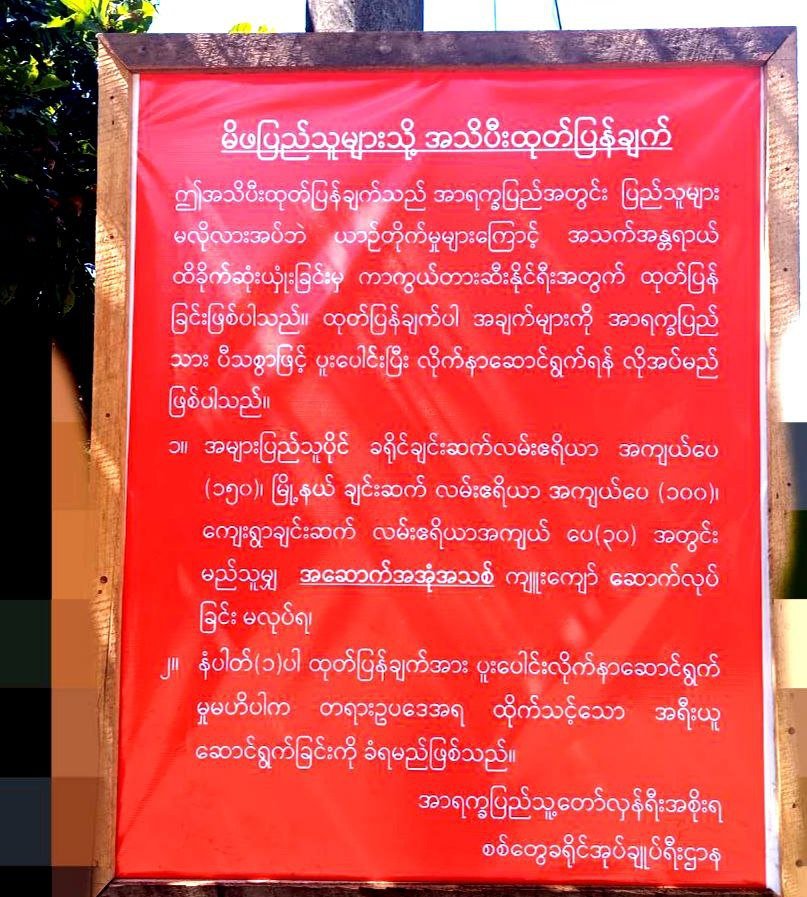 အဲဒီမြို့၊ရွာဒေသအလိုက် ပြည်သူအများစုသွားလာနေကြတဲ့ လမ်းမတွေ၊ လမ်းဆုံ၊ လမ်းခွတွေအပါအဝင် ထင်သာမြင်သာရှိတဲ့နေရာတွေမှာ အာရက္ခပြည်သူ့တော်လှန်ရေးအစိုးရက ဆိုင်း ဘုတ်တွေနဲ့အသိပေးတားမြစ်ထားတာပါ။