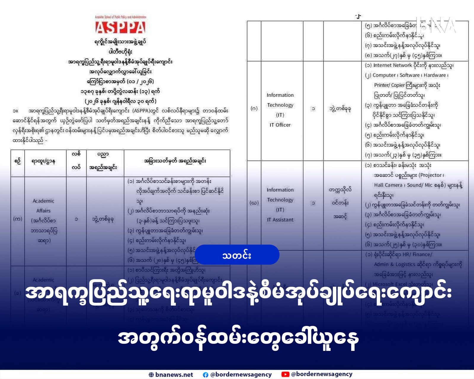 အာရက္ခဒေသမှာရှိတဲ့ အာရက္ခပြည်သူ့ရေးရာမူဝါဒနဲ့ စီမံအုပ်ချုပ်ရေးကျောင်း (ASPPA) မှာလစ်လပ်နေတဲ့ နေရာတွေအတွက် ဝန်ထမ်းအသစ်တွေကို ပြီးခဲ့တဲ့ ဇန်နဝါရီလ ၃၀ ရက်နေ့ကတည်းက စတင်ခေါ်ယူနေတာ ဖြစ်ပါတယ်။