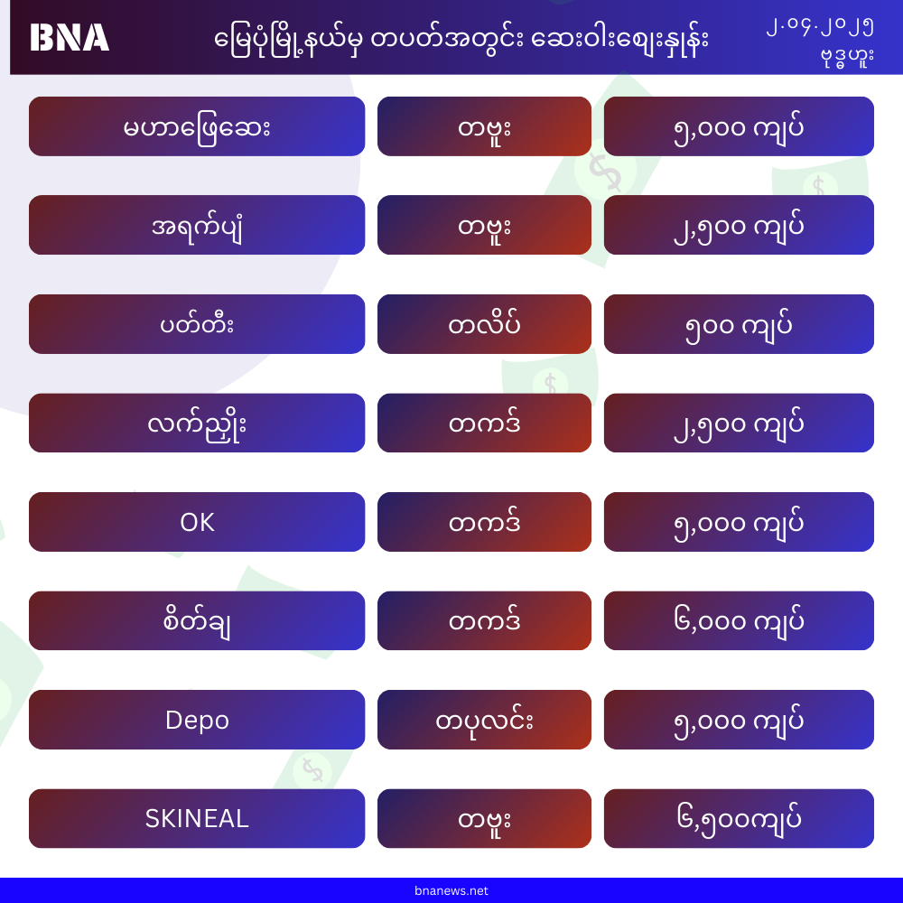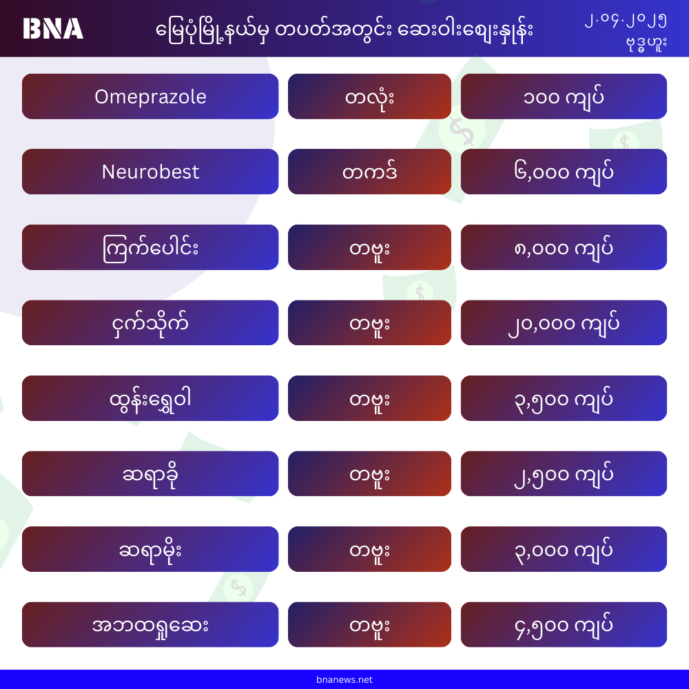 အဲဒီစျေးနှုန်းတွေဟာ Border News Agency က မေးမြန်းထားလို့ရသလော က်သာဖြစ်တာမို့ စျေးနှုန်းကွာနေတာတွေ၊တခြားဆေးဝါးစျေးနှုန်းတွေကိုလည်း ဝင်ရောက်ရေးခဲ့နိုင်ပါတယ်။