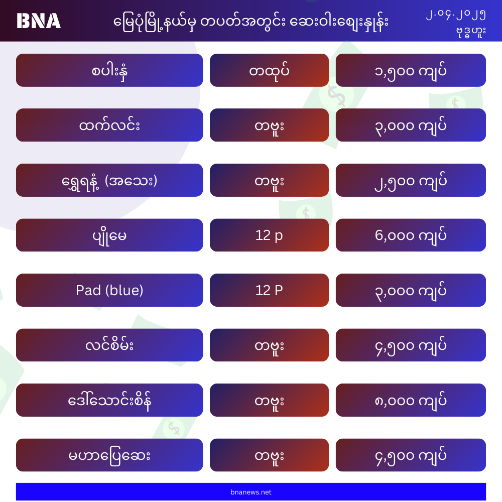 အာရက္ခတပ်တော်ထိန်းချုပ်နယ်မြေတွေက အခြေခံစားသောက်ကုန်း၊ အခြေခံလူသုံးကုန်၊ အခြေခံဆေးဝါး၊ အခြေခံအိမ်ဆောက်ပစ္စည်းစျေးတွေကိုလည်း ဆက်လက်ဖော်ပြပေးပါမယ်။