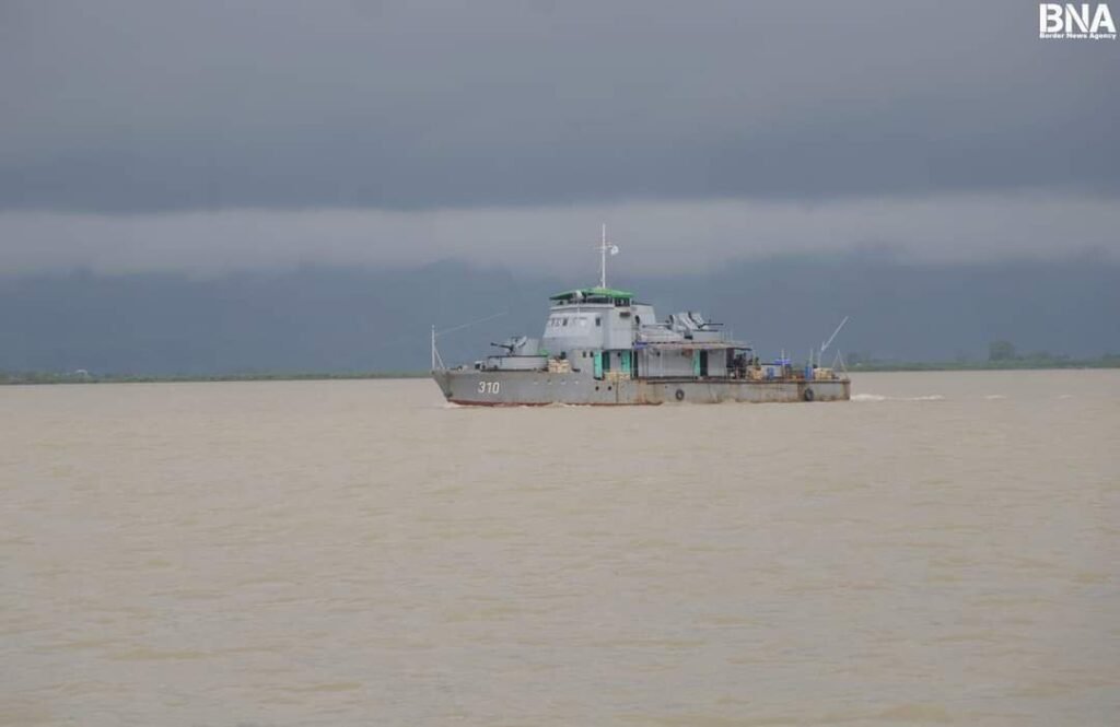 (ဓာတ်ပုံ – စစ်တွေမြို့နယ်၊ ရေချမ်းပြင်ကျေးရွာအနီးတွေ့ရတဲ့စစ်ကောင်စီရေတပ်စစ်သင်္ဘောတစင်း / BNA)
