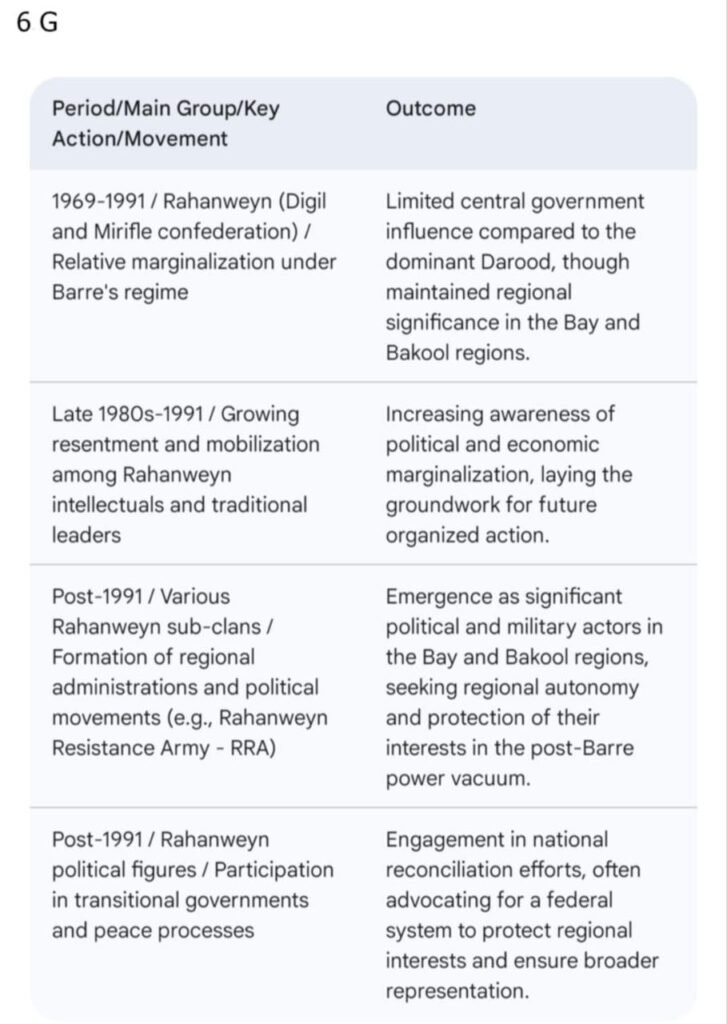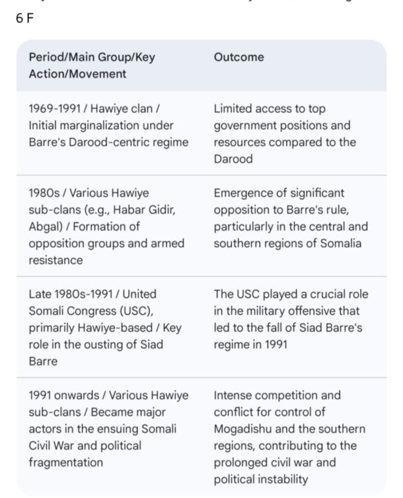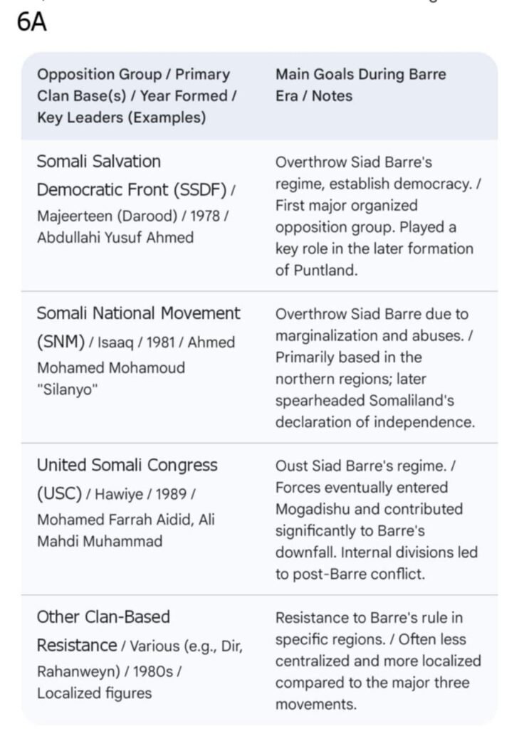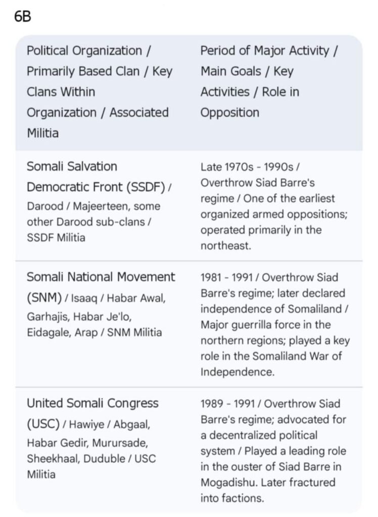 ၏(Somali National Movement- SNM)သည်လည်းကောင်း၊ဒါရုဒ်အုပ်စုခွဲဖြစ်သော မာဂျီးတင်းဆွေမျိုးစု (Majeeteen Clan)များ၏ (Somali Salvation Democratic Front -SSDF) သည်လည်းကောင်း၊ဟာဝီယီးဆွေမျိုးစုတို့၏(United Somali Congress- USC)သည်လည်းကောင်း ထင်ရှားကြသည်။