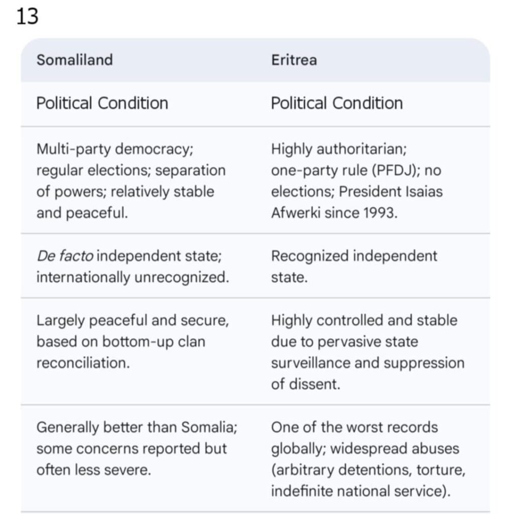အီရီထရီးယားတွင်မတူကွဲပြားမှုများအားဖိနှိပ်ခြင်း၊ စောင့်ကြည့်ခြင်းကြောင့် နိုင်ငံရေးတည်ငြိမ်နေသလိုဖြစ်နေသော် လည်း ပြည်သူလူထုတွင် လုံခြုံအေး ချမ်းမှုမရှိပေ။ဆိုမာလီလန်၌ နိုင်ငံရေး၊ အုပ်ချုပ်ရေးပြဿနာများကိုကိုင်တွယ်ရာတွင် ဆုံးဖြတ်ချက်သည် အောက် ခြေမှအထက်သို့ သွားသော်လည်း အီရီထရီးယားတွင် အထက်မှ အောက်သို့သွားသည်။