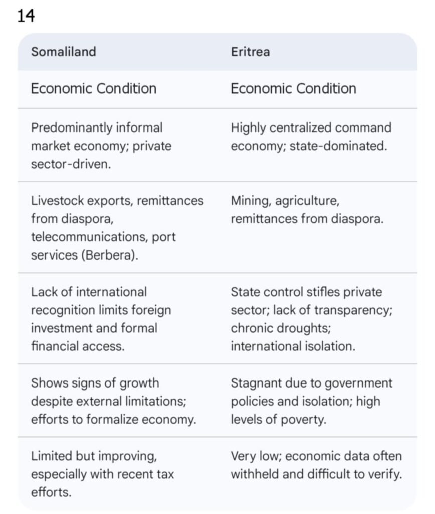 ဆိုမာလီလန်အနေဖြင့် အကန့်အသတ်များရှိပြီး ဆင်းရဲသော်လည်း တိုးတက်မှုလက္ခဏာကပြနေသည်။ပုံမှန်စီးပွားရေးလည်ပတ်မှုရှိသည်။အီရီထရီးယားကာ အုပ်ချုပ်သူလူတန်းစားများက ငါသာသိ၊ငါသာတတ်ပုံစံအောက်တွင် လူထုမှာဆင်းရဲမွဲတေမှုအောက်ပိတ်မိနေသည်။ဆိုမာလီလန်တွင် စီးပွားရေးအား မထိခိုက်အောင် အသေးစိတ်ကျသည့် အခွန်အခစနစ်များရှိသည်။