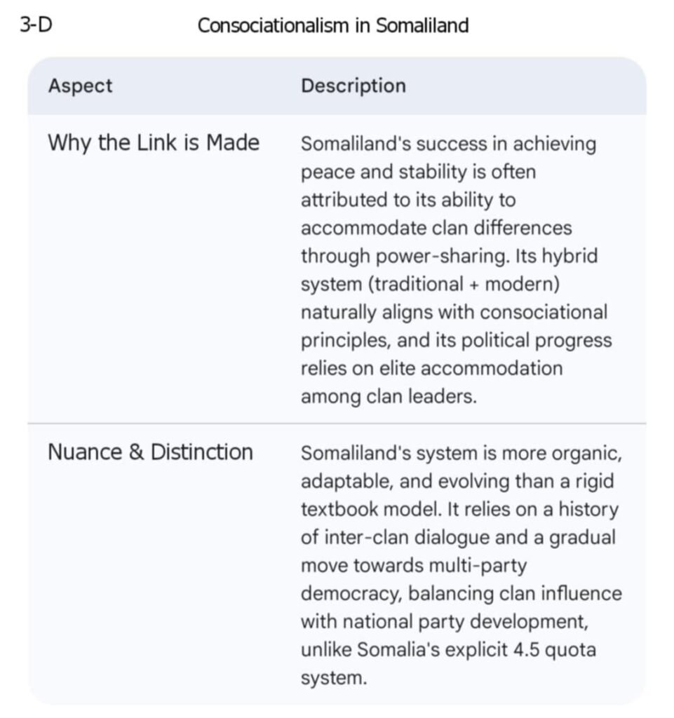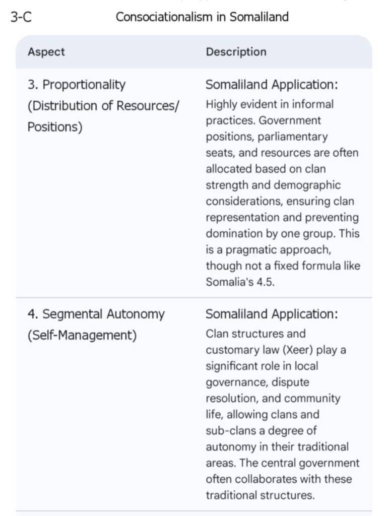 ဆိုမာလီလန်တွင် နိုင်ငံရေးပြဿနာများကိုဖြေရှင်းရာ၌ လူမျိုးစုအချင်းချင်း အောက်ခြေမှအထက်သို့ ရင်ကြား စေ့ရေးပုံစံဖြင့်ဖြေရှင်းသောကြောင့် နိုင်ငံရေးတည်ငြိမ်မှုနှင့်ပြည်သူလူထုတွင် လုံခြုံငြိမ်းချမ်းမှုရှိသည်။
