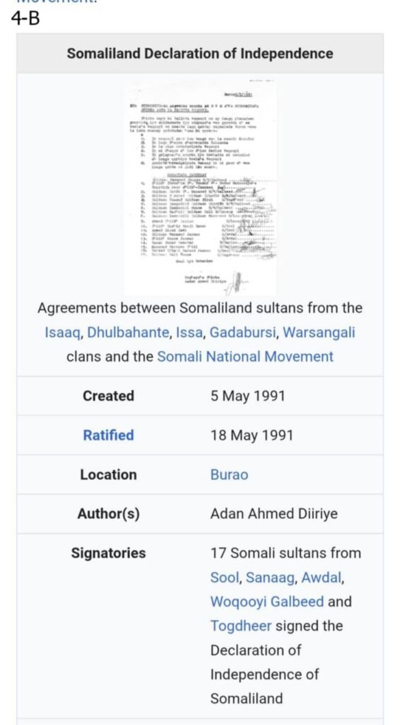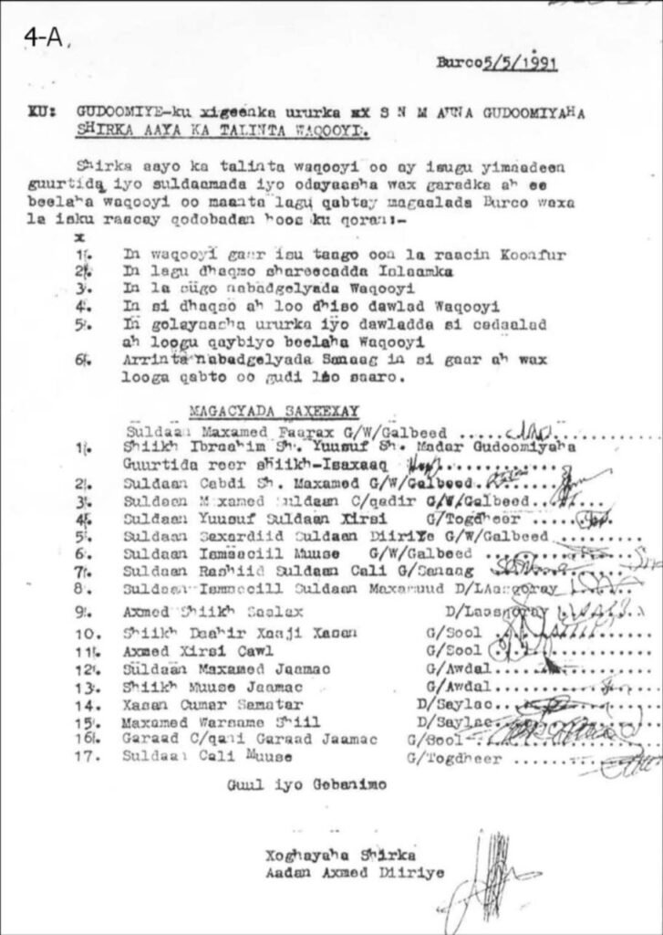 ထိုဆွေမျိုးစုများကို စည်းရုံးနိုင်ပြီးခါမှ ဆူလ်( Sool)၊ဆန်နားဂျ် (Sanaag)၊ အော်ဒလ် (Awdal)၊ ဝိုကူးယီ ဂဲလ်ဘီးဒ် ( Woqooyi Galbeed)နှင့်(တိုဂျီးယား (Togdheer)စသည့်ဒေသများမှ ဆွေ မျိုးစု ဆူလတန် ၁၇ ဦးမှလွတ်လပ်ရေးကြေညာခဲ့ခြင်းဖြစ်သည်။