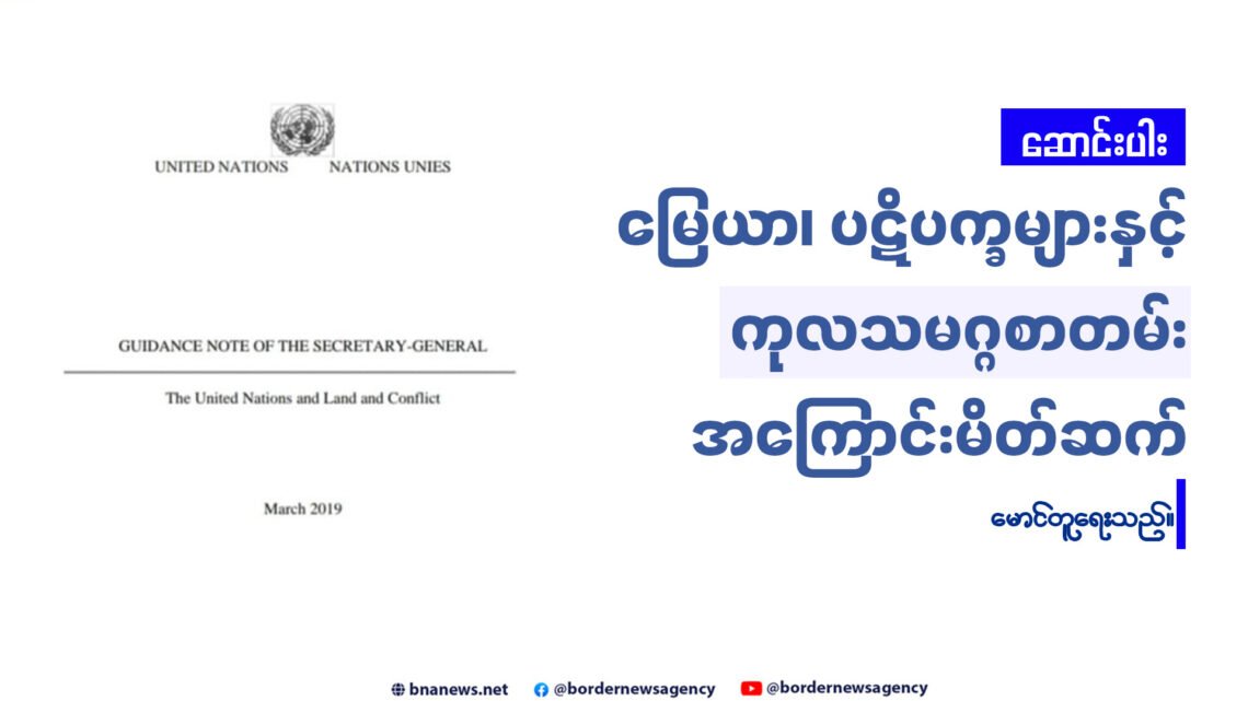 ထိုကိစ္စရပ်များသည် မြေပြဿနာနှင့်ဆက်နွယ်ပြီး နိုင်ငံတကာစံနှုန်းများက ချဉ်းကပ်ထားသည့်အချက်များမှာ “ကုလသမဂ္ဂအထွေထွေအတွင်းရေးမှူးချုပ်၏ မြေနှင့်ပဋိပက္ခဆိုင်ရာလမ်းညွှန်ချက်မှတ်စု” တွင်ဖော်ပြထားပေသည်။