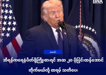 Border News Agencyအီရန်၊မတ် ၁၁။ အီရန်နိုင်ငံအနေနဲ့ အရှေ့အလယ်ပိုင်းကရေနံတင်ပို့မှုတွေကို ပိတ်ပင်ဖို့သာကြိုးစားလာမယ်ဆိုရင် အခုထက် "အဆ ၂၀ ပိုပြင်းထန်တဲ့" တိုက်ခိုက်မှုတွေနဲ့ တုံ့ပြန်သွားမယ်လို့ အမေရိကန်သမ္မတ ဒေါ်နယ်ထရမ့်ကသတိပေးလိုက်ပါတယ်။ အမေရိကန်နဲ့ အစ္စရေးတို့ရဲ့ တိုက်ခိုက်မှုတွေမရပ်မချင်း အရှေ့အလယ်ပိုင်းဒေသက ဘယ်ရေနံကိုမှအပြင်ပေးမထွက်ဘူးလို့...