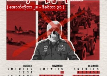 Read moreBorder News Agencyနေပြည်တော်၊ အောက်တိုဘာ ၂၈။ စစ်ကော်မရှင်ရဲ့တရားမဝင်အတုအယောင်ရွေးကောက်ပွဲကို လူထုစုပေါင်းအားနဲ့ သပိတ်မှောက်ဆန့်ကျင်ရေးလှုပ်ရှားမှု တော်လှန်ရေးအင်အားစုတွေ ပြုလုပ်နေကြပါတယ်။ အဲဒီလှုပ်ရှားမှုကာလကို ရက်ပေါင်းခြောက်ဆယ်ငါးရက် တရားဝင်သတ်မှတ်လိုက်တယ်လို့ ဆိုပါတယ်။ အဲဒီသတ်မှတ်ကာလဟာ အောက်တို ဘာလ ၂၈ ရက်၊ ဒီနေ့ကစတင်ပြီး...