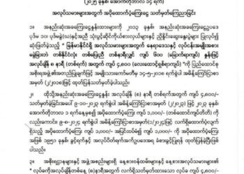 Read moreBorder News Agencyနေပြည်တော်၊ အောက်တိုဘာ ၁၅။ စစ်ကော်မရှင်ကအလုပ်သမားတွေရဲ့ လုပ်ခလစာတနေ့ကို ၇၈၀၀ ကျပ်သတ် မှတ်လိုက်တယ်လို့ စစ်ကော်မရှင်ရဲ့အခကြေးငွေသတ်မှတ်ရေးဆိုင်ရာအမျိုးသားကော်မတီက အောက်တိုဘာလ ၁၄ ရက်၊ မနေ့ကထုတ်ပြန်ပါတယ်။ အဲဒီအလုပ်သမားတွေရဲ့လုပ်ခလစာကို အပိုထောက်ပံ့ကြေး ၁၀၀၀ ကျပ်ထပ်မံခံစားခွင့်ပြုတဲ့အတွက် ခုအောက်တို...
