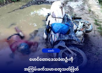 Read moreBorder News Agencyမောင်တော၊ အောက်တိုဘာ ၁၁။ မောင်တောမြို့နယ်မှာ အကြမ်းဖက်သမားတွေသတ်ဖြတ်လို့ အရပ်သားတဦးသေဆုံးခဲ့တယ်လို့ အာရက္ခတပ်တော် (AA)က အောက်တိုဘာလ ၁၁ ရက်၊ ဒီနေ့ထုတ်ပြန်ပါတယ်။ အဲဒီမောင်တောမြို့နယ်၊ လိပ်ရခွဆုံတောင်ဘက်မီတာနှစ်ရာခန့်အကွာမှာ အောက်တိုဘာလ ၁၁ ရက်၊ဒီနေ့ နေ့လည်...