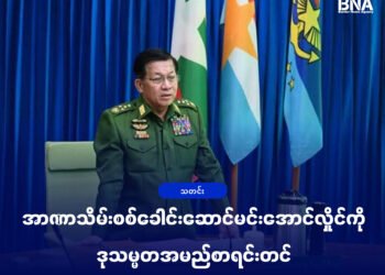 Read moreBorder News Agencyနေပြည်တော်၊ မတ် ၃၀။ အာဏာသိမ်းစစ်ခေါင်းဆောင်မင်းအောင်လှိုင်ကို မတ်လ ၃၀ ရက်၊ ဒီနေ့ပြည်သူ့လွှတ်တော်ကိုယ်စားလှယ်က ဒုတိယသမ္မတလောင်းအမည်စာရင်းတင်ခဲ့ပါတယ်။ အဲဒီအစည်းအဝေးမှာ ဒုတိယသမ္မတလောင်းတွေအဖြစ် စစ်ခေါင်းဆောင်မင်းအောင်လှိုင်နဲ့ ဒေါက်တာကျော်ဆွေကို သက်အဆိုပြုတင်ခဲ့ကြတာပါ။ အဲဒီနှစ်ဦးကိုပြည်သူ့လွှတ်တော်ဥက္ကဋ္ဌက အတည်ပြုကြေညာခဲ့ပါတယ်။ ဒါဟာစစ်ကော်မရှင်တပ်က အာဏာတည်မြဲဖို့...