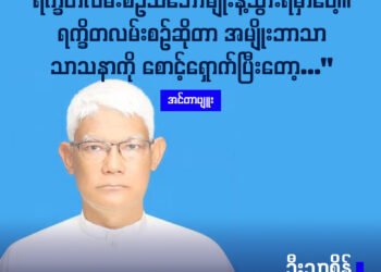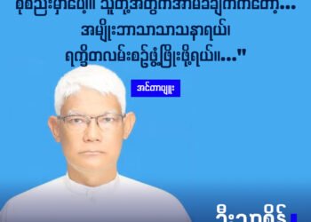 Read moreအင်တာဗျူးBorder News Agencyရန်ကုန်၊ စက်တင်ဘာ ၂။ လာမယ့်ဒီဇင်ဘာလ ၂၈ ရက်နေ့မှာစစ်ကော်မရှင်က ရွေးကောက်ပွဲကျင်းပမယ်လို့ ထုတ်ပြန်ထားပါတယ်။ အဲဒီမှာပြည်သူ့ပါတီက ရန်ကုန်တိုင်းမှာတိုင်းရင်းသားရေးရာကိုယ်စားလှယ်ဝင်ပြိုင်မှာပါ။ အဲဒီကိုယ်စားလှယ်လောင်းဦးသာစိန်ကိုပေါ်ဗျူလာဂျာနယ်က သီးသန့်အင်တာ ဗျူးမေးထားတာကို ပြည်သူလူထုသိအောင် ဖော်ပြလိုက်ပါတယ်။ "ကျွန်တော်ကတော့…ရန်ကုန်မှာရှိနေတဲ့ရခိုင်တွေကိုစုစည်းမှာပေါ့။ သူတို့အတွက်အာမခံချက်ကတော့… အမျိုးဘာသာ...