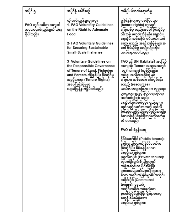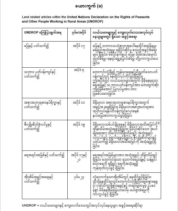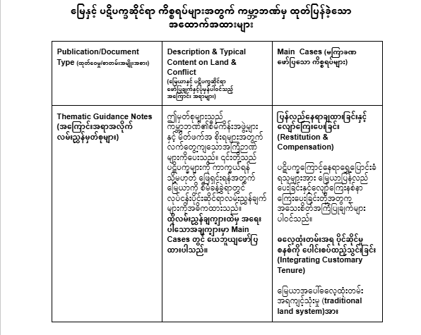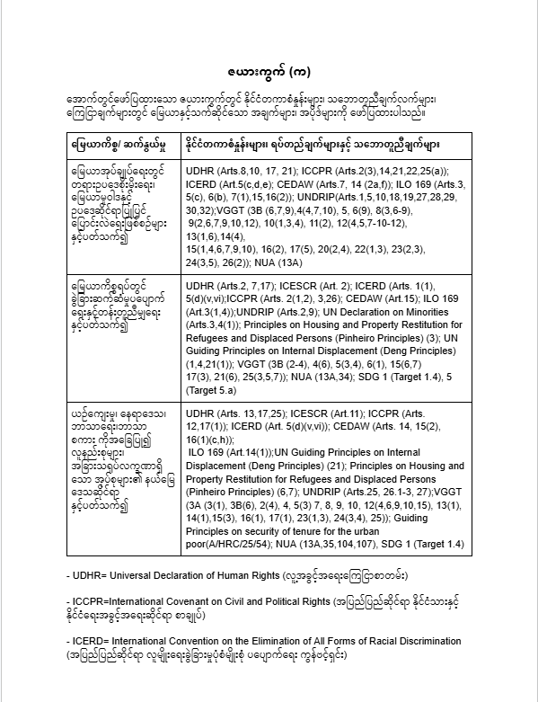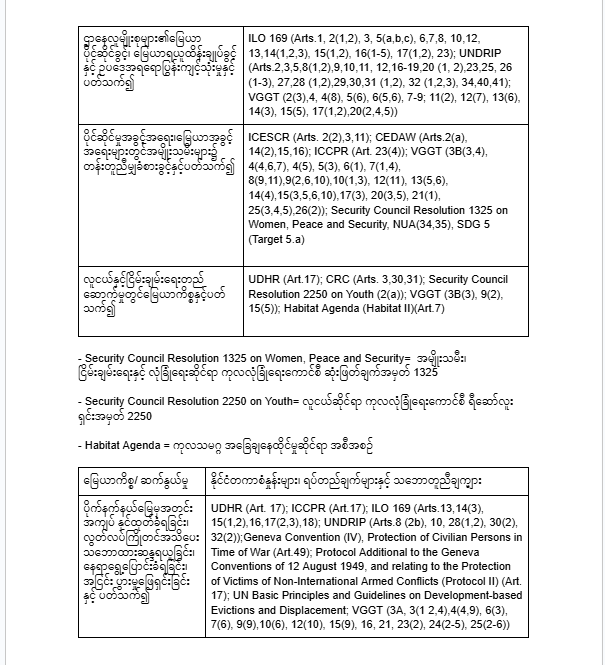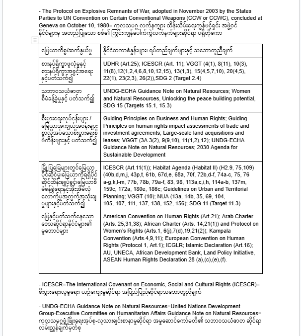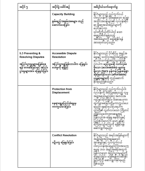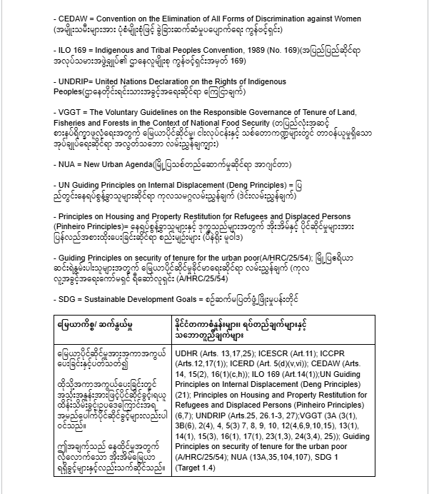မြေယာနှင့်ပဋိပက္ခကိစ္စရပ်တွင် တရားမျှတမှု၊တရားဥပဒေစိုးမိုးမှုနှင့်ပတ်သ က်၍တရားဥပဒေဆိုင်ရာညှိနှိုင်းရေးနှင့်တရားမျှတမှုဆိုင်ရာသုတေသနအဖွဲ့များလည်း ကုလသမဂ္ဂယန္တရားများ၏ အစည်းအဝေးများတွင်ပါဝင်ရမည်ဖြစ် သည်။