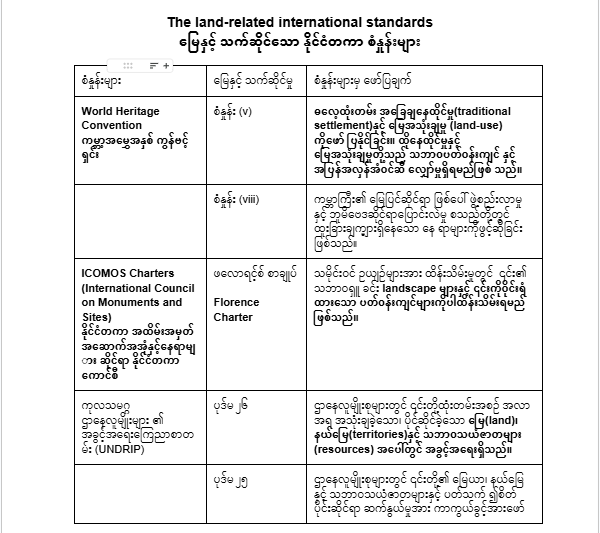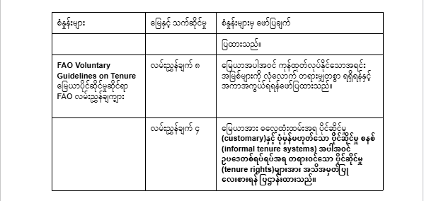 မြေယာနှင့်ပတ်သက်၍ နိုင်ငံတကာစံနှုန်းများ၊ လုပ်နည်းကိုင်နည်းများဖော်ပြချက်ဇယားတွင် မည်သည့်စံနှုန်းများက မြေယာနှင့်မည်သည့်နယ်ပယ်တွင် ဆက်စပ်သည်ကို အသေးစိတ်ပုဒ်မများဖြင့် ဖော်ပြထားသည်။
