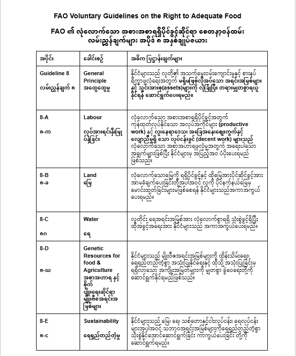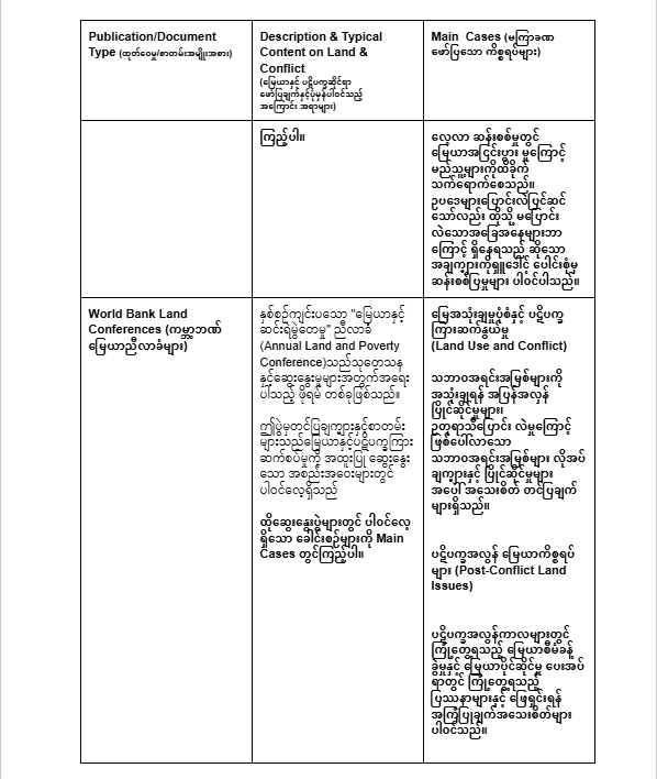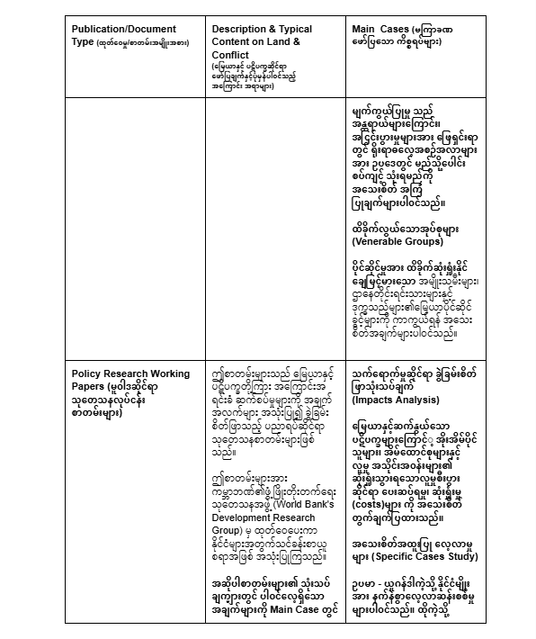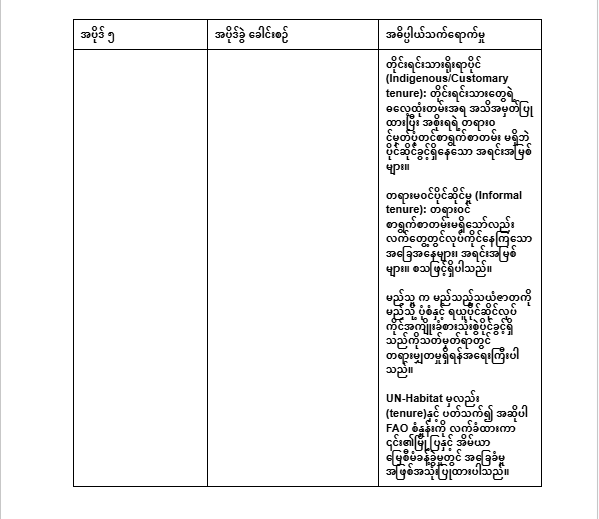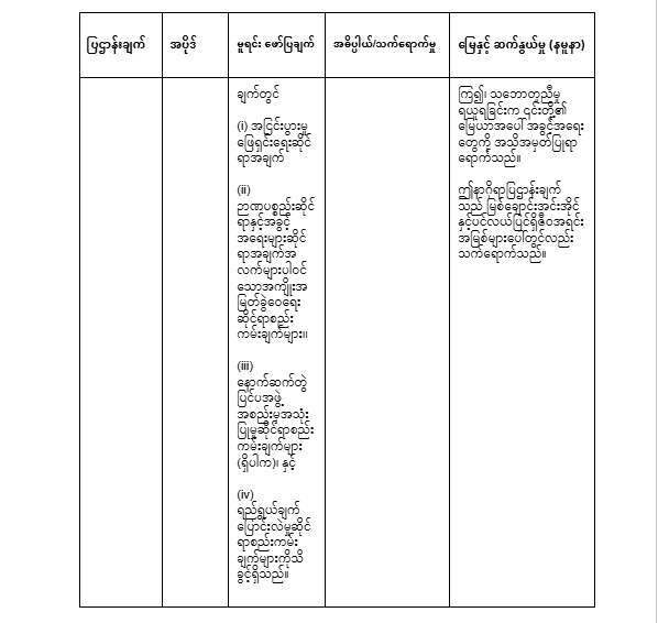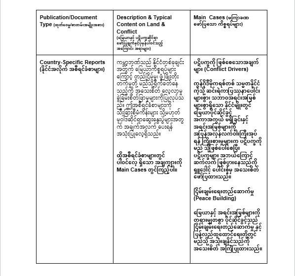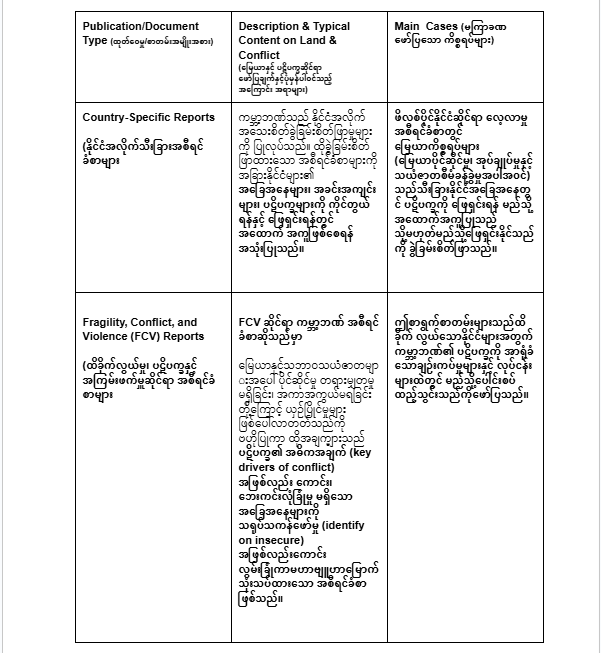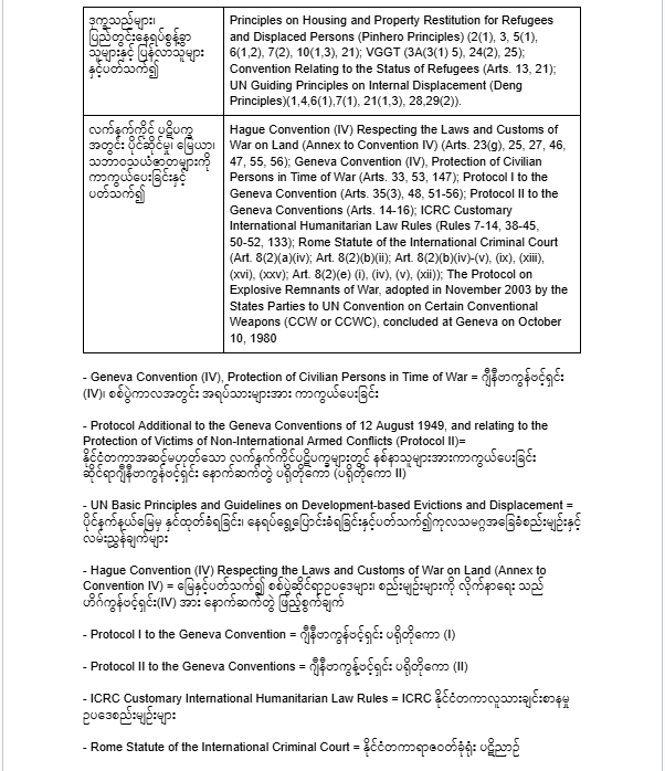 ဇယားကွက်အပိုင်း(က)သည် ကုလသမဂ္ဂအထွေထွေအတွင်းရေးမှူးချုပ်၏ မြေယာနှင့် ပဋိပက္ခဆိုင်ရာလမ်းညွှန်ချက်မှတ်စုထဲတွင်ပါဝင်သော အပိုင်းဖြစ်သည်။