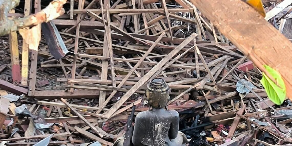 စစ်ကော်မရှင်တပ်ဟာ ပန်းသပြေကျေးရွာကို လေကြောင်းတိုက်ခိုက်ခဲ့တာကြောင့် ဘုန်းကြီးကျောင်းနဲ့နေအိမ်နှစ်ဆယ်ပျက်စီးသွားခဲ့တာပါ။