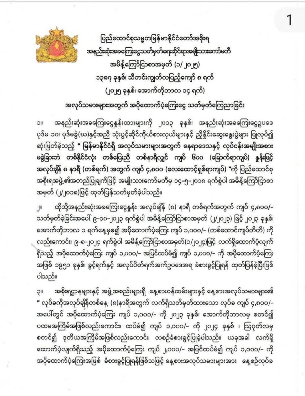 အစိုးရဌာနတွေနဲ့အဖွဲ့အစည်းတွေရှိ နေ့စားဝန်ထမ်းတွေနဲ့ နေ့စားအလုပ်သမားတွေရဲ့ လုပ်ခလစာကို အလုပ်ချိန်တနေ့ ၈ နာရီအတွက် လက်ရှိသတ်မှတ်ထားတဲ့လုပ်ခ ၄၈၀၀ ကျပ်အပေါ် အပိုထောက်ပံ့ကြေး ၁၀၀၀ ကျပ်ကို ၂၀၂၃ ခုနှစ်၊အောက်တိုဘာလက ပထမအကြိမ်နဲ့ ၂၀၂၄ ခုနှစ် ဩဂုတ်လက ဒုတိယအကြိမ်အဖြစ် လစဉ်ခံစားခွင့်ပြုခဲ့တယ်လိို့ဆိုပါတယ်။