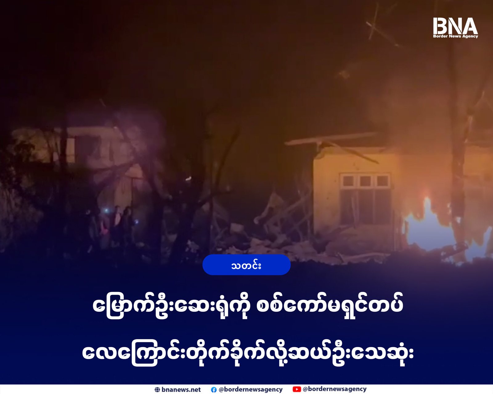 အာရက္ခတပ်တပ်တော်(AA)ထိန်းချုပ်ထားတဲ့မြောက်ဦးဆေးရုံကိုဒီဇင်ဘာ လ ၁၀ ရက်နေ့ ည ၉ နာရီ ၁၃ မိနစ်ခန့်အချိန်မှာ စစ်ကော်မရှင်တပ်လေကြောင်းတိုက်ခိုက်လို့ ဆေးကုသမှုခံယူနေသူဆယ်ဦးသေဆုံးသွားပြီးအများအပြားဒဏ်ရာရသွားတယ်လို့ အာရက္ခပြည်သူ့ကျန်းမာရေးဌာနကထုတ်ပြန်ပါတယ်။