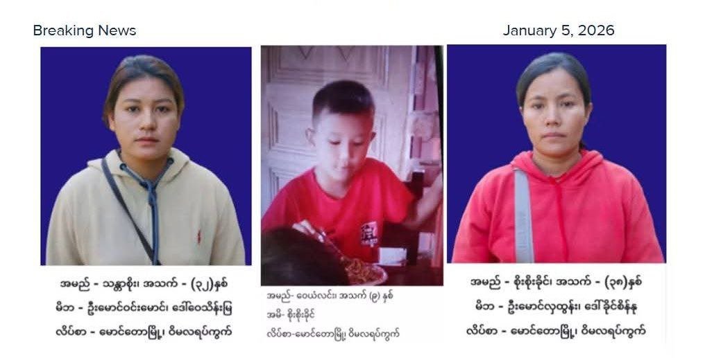 အဲဒီမောင်တောမြို့မှ အသက်ရှစ်နှစ်အရွယ် မောင်ဝေယံလင်း၊ အသက်သုံးဆယ့်နှစ်နှစ်အရွယ် ဒေါ်သန္တာစိုး၊ အသက်သုံးဆယ့်ရှစ်နှစ်အရွယ် ဒေါ်စိုးစိုးခိုင်ကို ရိုဟင်ဂျာအမည်ခံလက်နက်အကြမ်းဖက်သမားတွေ ဖမ်းဆီးထားတာပါ။