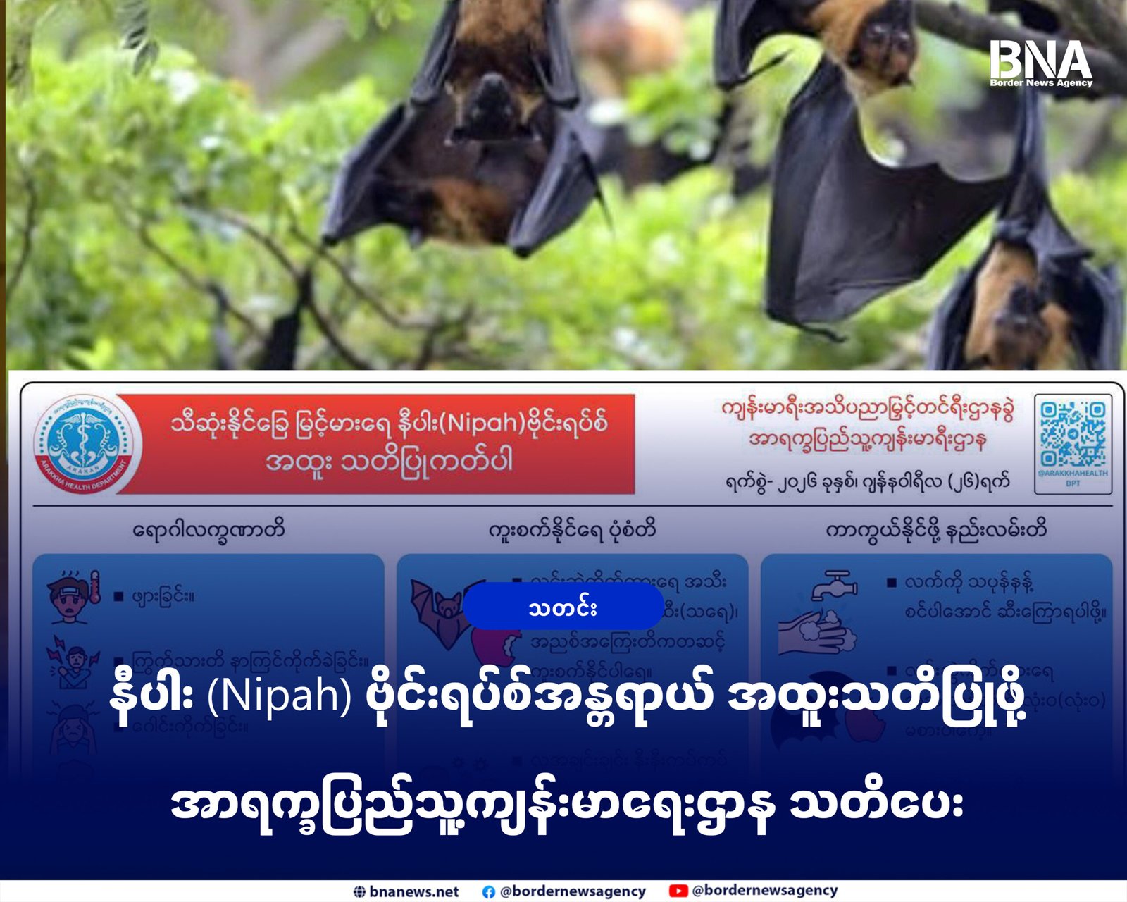 သေဆုံးနိုင်ခြေလေးရာခိုင်နှုန်းကနေခုနှစ်ဆယ့်ငါးရာခိုင်နှုန်းအထိရှိနေတဲ့ နီပါး (Nipah Virus) ဗိုင်းရပ်စ်ပိုး အန္တရာယ်နဲ့ ပတ်သက်ပြီး ပြည်သူတွေအနေနဲ့ အထူးသတိပြုနေထိုင်ကြဖို့ အာရက္ခပြည်သူ့ကျန်းမာရေးဌာနက ဇန်နဝါရီလ၂၇ ရက်၊ဒီနေ့မှာ အသိပေးထုတ်ပြန်လိုက်ပါတယ်။