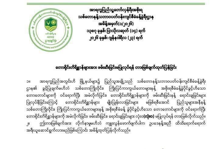 ပြည်သူတွေအနေနဲ့ သစ်တောကြိုးဝိုင်း၊ ကြိုးပြင်ကာကွယ်တောတွေနဲ့ အစိုးရစီမံခန့်ခွဲပိုင်ခွင့်ရှိတဲ့ တောတောင်တွေကို ဝင်ရောက်ပြီး တောရိုင်းတိရစ္ဆာန်တွေကိုအမဲလိုက်တာ၊ ဖမ်းဆီးတာ၊ ရောင်းချတာတွေ လုံးဝမပြုလုပ်ရဘူးလို့ ဆိုပါတယ်။