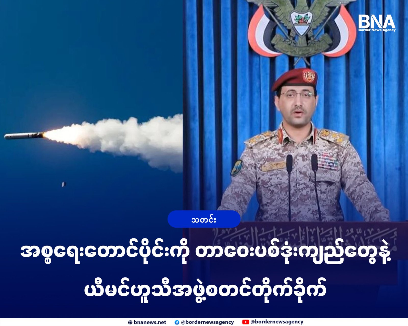 အစ္စရေးနိုင်ငံတောင်ပိုင်းကအရေးပါတဲ့ စစ်ရေးပစ်မှတ်တွေကို ဘောလစ်စတစ်ဒုံးကျည်အမြောက်အမြားနဲ့ ပထမဆုံးအကြိမ်တိုက်ခိုက်လိုက်ပြီလို့ ယီမင်လက်နက်ကိုင်တပ်ဖွဲ့ (ဟူသီ)ပြောရေးဆိုခွင့်ရှိသူ ဗိုလ်ချုပ်ယာဟယာဆာရီယေးက မတ်လ ၂၈ ရက်၊ ဒီနေ့မှာကြေညာလိုက်ပါတယ်။