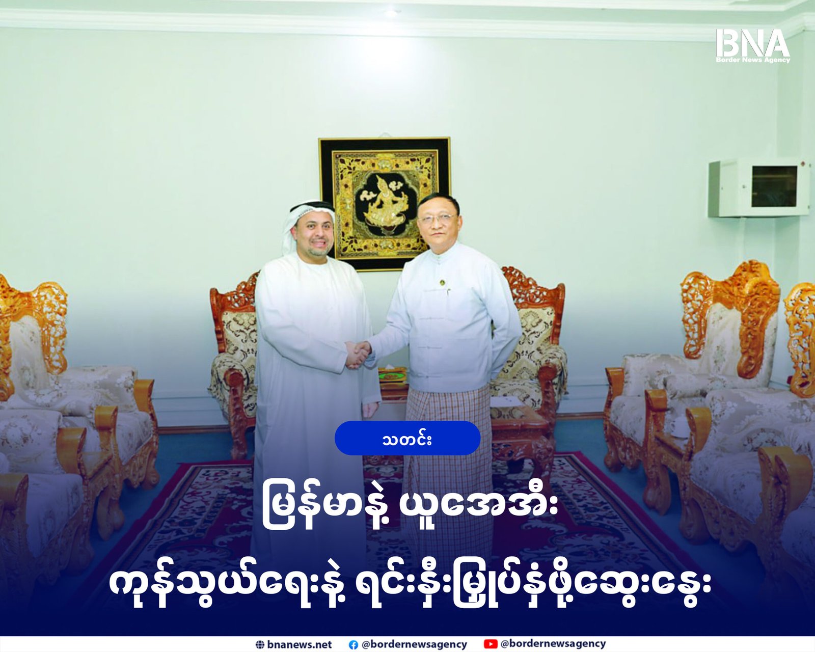 မြန်မာနိုင်ငံခြားရေးဝန်ကြီးဌာန ဒုတိယဝန်ကြီးဦးကိုကိုကျော်နဲ့ မြန်မာနိုင်ငံဆိုင်ရာအာရပ်စော်ဘွားများပြည်ထောင်စု (UAE)သံအမတ်ကြီး မစ္စတာမူတာ့ဇ်အဗ္ဗဒူလာတို့ မတ်လ ၃၀ ရက်နေ့က နေပြည်တော်မှာတွေ့ဆုံဆွေးနွေးခဲ့ကြပါတယ်။