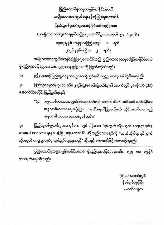 အမျိုးသားကာကွယ်ရေးနဲ့ လုံခြုံရေးကောင်စီ ကာလုံဟာ ဖွဲ့စည်းပုံအခြေခံဥပဒေ ပုဒ်မ ၄၂၇ အရ ပြည်သူ့စစ်မှုထမ်းဥပဒေကို ပြင်ဆင်တဲ့ဥပဒေသစ်တရပ်ကို ဧပြီ ၂ ရက်နေ့မှာ အတည်ပြု ပြဋ္ဌာန်းလိုက်ပါတယ်။