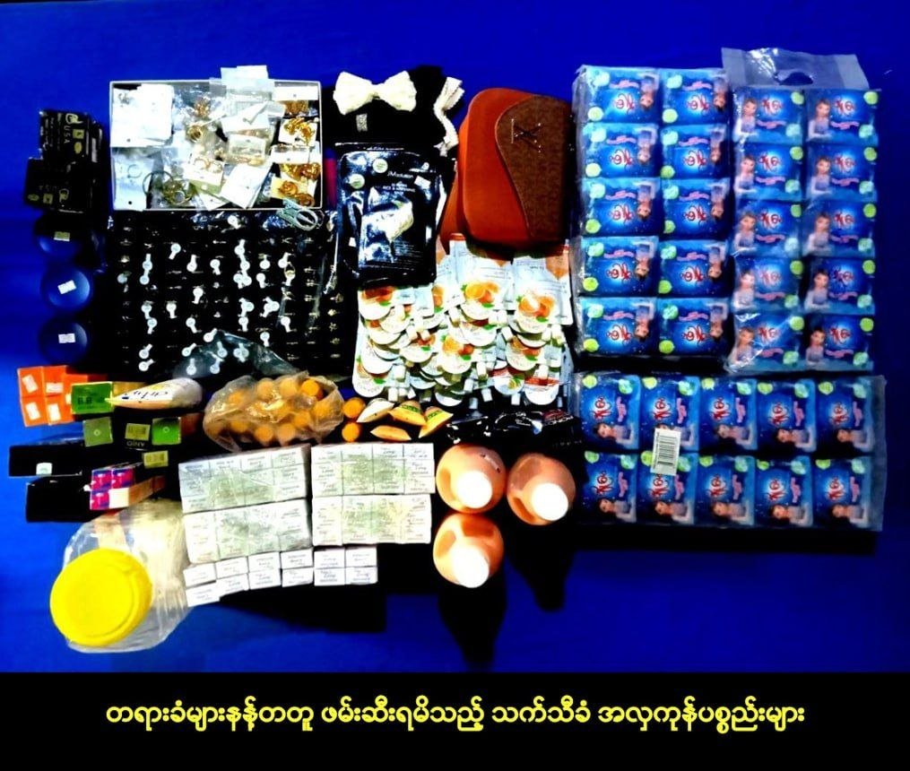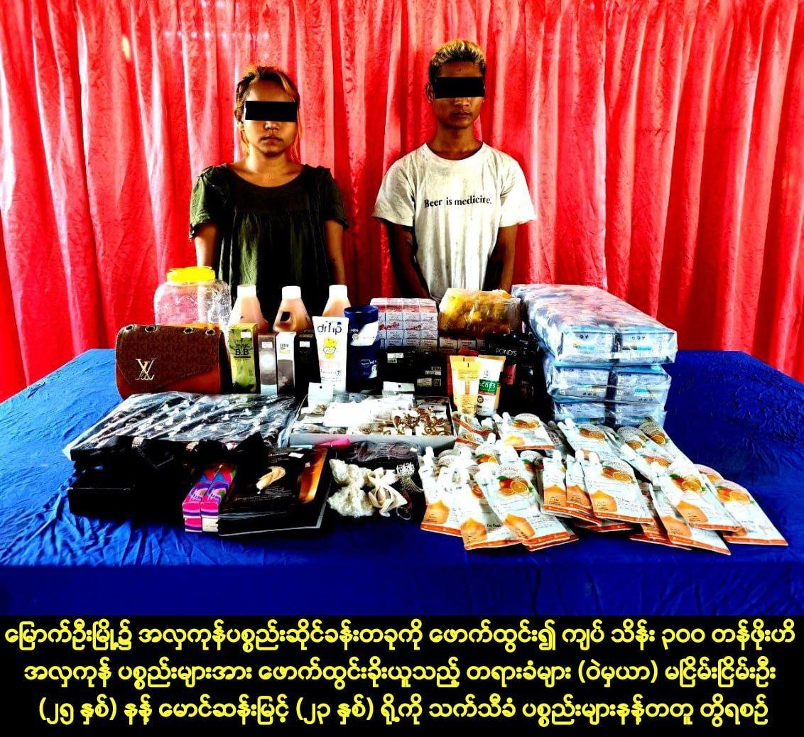 မြောက်ဦးမြို့၊ ကုန်သည်တန်းရပ်ကွက်က အလှကုန်ဆိုင်တဆိုင်ကိုဖောက်ထွင်းပြီး ကျပ်သိန်း ၃၀၀ ကျော်ဖိုး ပစ္စည်းတွေခိုးသွားတဲ့သူ ၂ ဦးကို ခိုးရာပါပစ္စည်းတွေနဲ့အတူဖမ်းမိခဲ့တယ်လို့ အာရက္ခတပ်တော်ရဲ့တရားဥပဒေစိုးမိုးရေးနဲ့ ပြည်သူ့လုံခြုံရေးအဖွဲ့က ဧပြီလ ၁၄ ရက်၊ ဒီနေ့ထုတ်ပြန်ပါတယ်။
