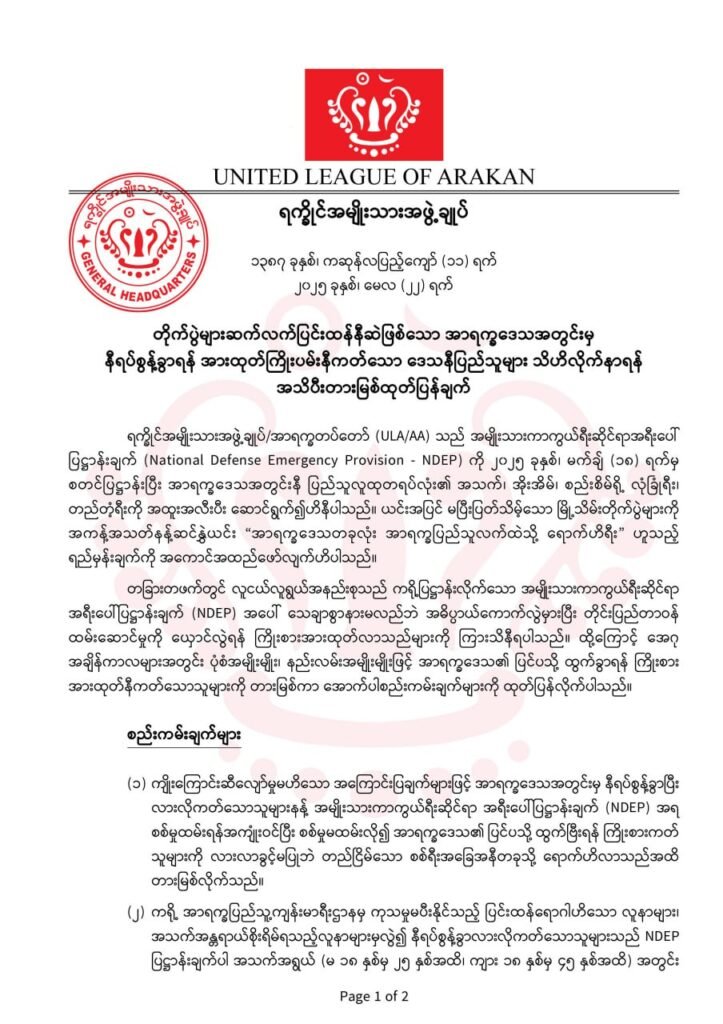 ရက္ခိုင်အမျိုးသားအဖွဲ့ချုပ်/အာရက္ခတပ်တော်(ULA/AA) မှာ အရေးပေါ်ကာလသတ်မှတ်ထားတယ်လို့ မေလ ၂၂ ရ က်၊ ဒီနေ့ထုတ်ပြန်ပါတယ်။