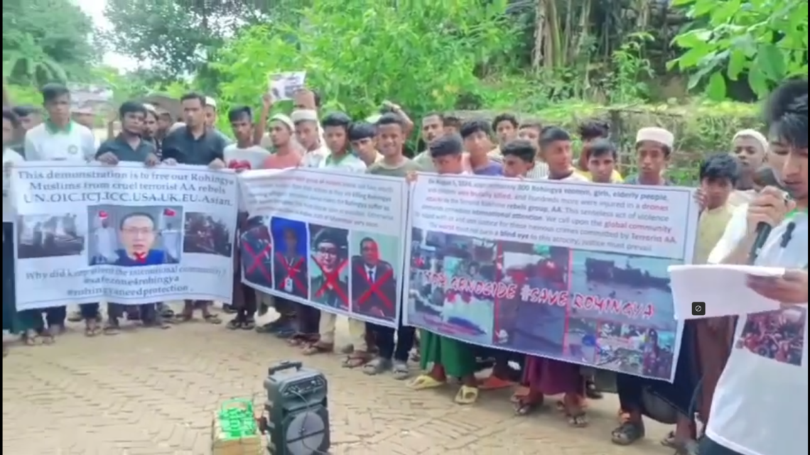 ဘင်္ဂလားဒေ့ရှ်နိုင်ငံ၊ဒုက္ခသည်စခန်းတွေရှိ ဒုက္ခသည်တချို့ဟာ အာရက္ခတပ်တော်ခေါင်းဆောင်တွေရဲ့ပုံတွေကို ကိုင်ပြီး ဆန္ဒပြတောင်းဆိုနေကြတာဖြစ်ပါတယ်။