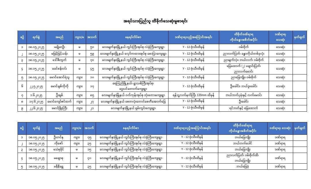 နောက်ပြီးတုံးတောကျေးရွာကအသက်ရှစ်ဆယ်ငါးနှစ်အရွယ်ဦးချစ်၊စောပြာကျေးရွာကအသက်ငါးဆယ့်ကိုးနှစ်အ ရွယ်ဒေါ်မြင့်မြင့်သန်း၊စေတလုံးတောင်စေတီအောက်ခြေကျေးရွာကအသက်