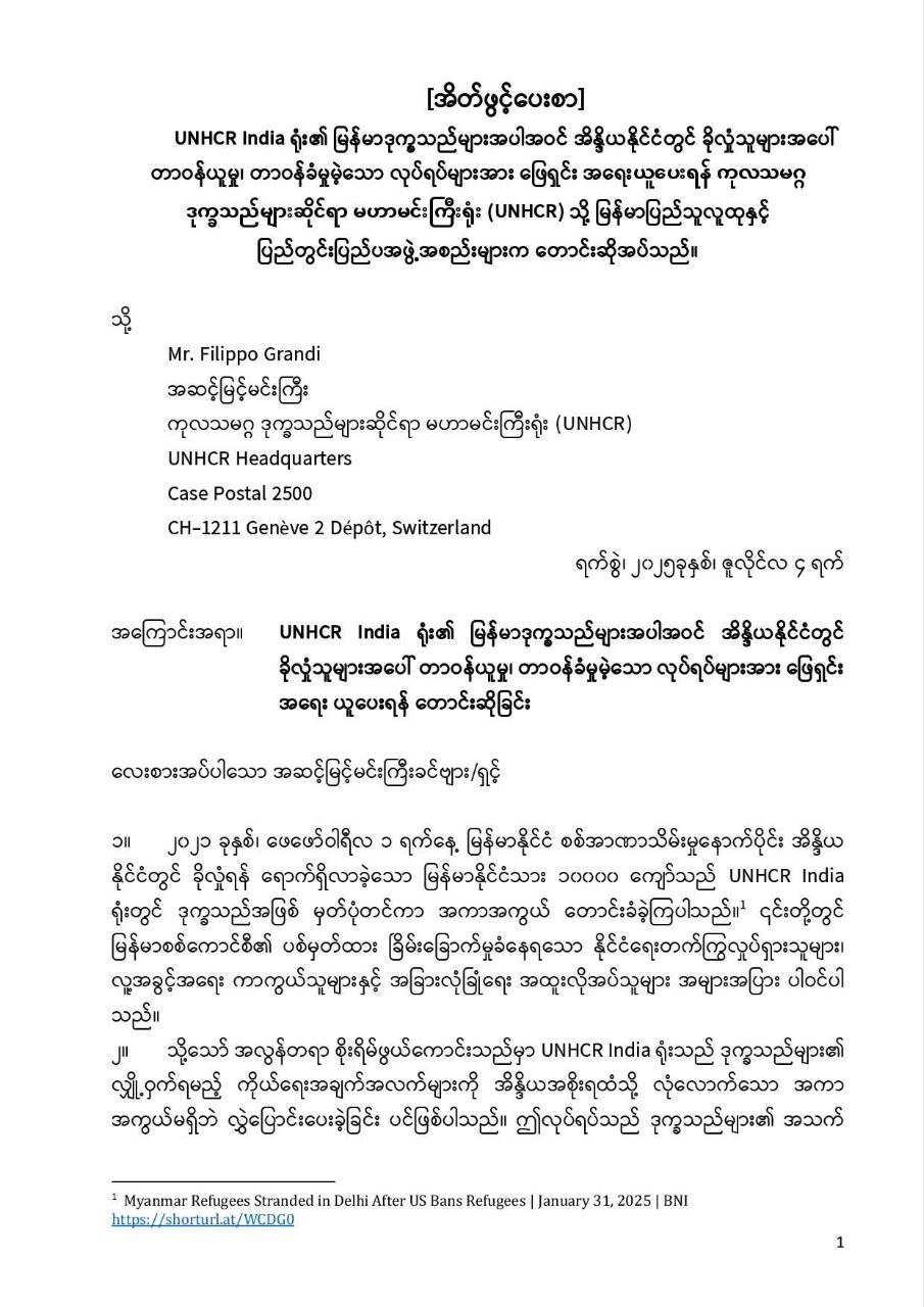အဲဒီဖြစ်ရပ်တွေအတွက် အိန္ဒိယရှိUNHCR ရုံးတာဝန်ရှိသူတွေကို အမြန်ဆုံးစုံစမ်းစစ်ဆေးပြီး ထိထိရောက်ရောက် အရေးယူဖို့၊ UNHCR ထံ ခိုလှုံခွင့်လျှောက်ထားတဲ့ မြန်မာနိုင်ငံရေးတက်ကြွ လှုပ်ရှားသူတွေ၊ဒုက္ခသည်တွေရဲ့လုံခြုံရေးစိန်ခေါ် မှုတွေကို အမြန်ဆုံးဖြေရှင်းပေးဖို့ တောင်းဆိုထားပါတယ်။