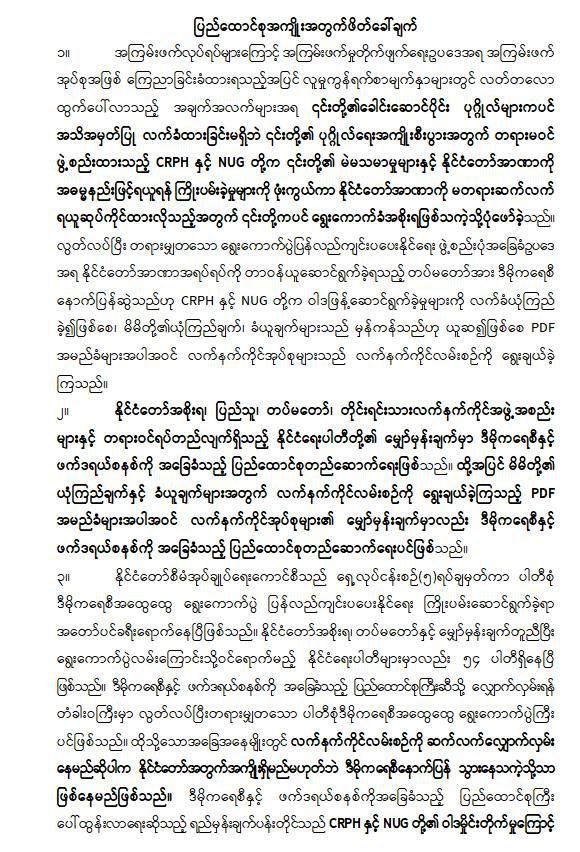 စစ်ကောင်စီပြုလုပ်မယ့်ရွေးကောက်ပွဲဟာ မြန်မာနိုင်ငံရဲ့ အခြေအနေတွေကို ပြေလည်စေမယ့် ထွက်ပေါက်မဟုတ်တာကြောင့် တော်လှန်ရေးအင်အားစုတွေဟာ ပင်မနိုင်ငံရေးလမ်းကြောင်းဖြစ်တဲ့ ဖက်ဒရယ်ဒီမိုကရေစီပဋိဉာဉ်နဲ့ နိုင်ငံရေးလမ်းပြမြေပုံတို့အတိုင်း ဆက်ရပ်တည်ဆောင်ရွက်သွားမှာဖြစ်တယ်လို့လည်း ဆိုပါတယ်။