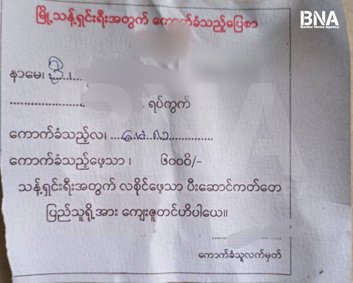 “ကျွန်မတို့ဆီမှာ နေအိမ်ဆိုရင် အိမ်အ မျိုးအစားပေါ်မှုတည်ပြီးတော့ အခွန်ဆောင်ရပါတယ်။ရိုးရိုးအိမ်ဆိုရင် နှစ်ထောင်ပါ။တိုက်အိမ်ဆိုရင်ခြောက်ထောင်ကောက်ယူပါတယ်။အိမ်ခွန်တခုကလွှဲပြီး ဘယ်အခွန်မဆို ခြောက်ထောင်သတ်မှတ်ထားပါတယ်။ အခွန်တိုင်းကို တနှစ်အတွင်း နှစ်ကြိမ်နဲ့အပြီးဆောင်ခိုင်းထားပါတယ်။” လို့ ပေါက်တောမြို့ နယ်မှအမျိုးသမီးတဦးက Border News Agency ကို ပြောပါတယ်။