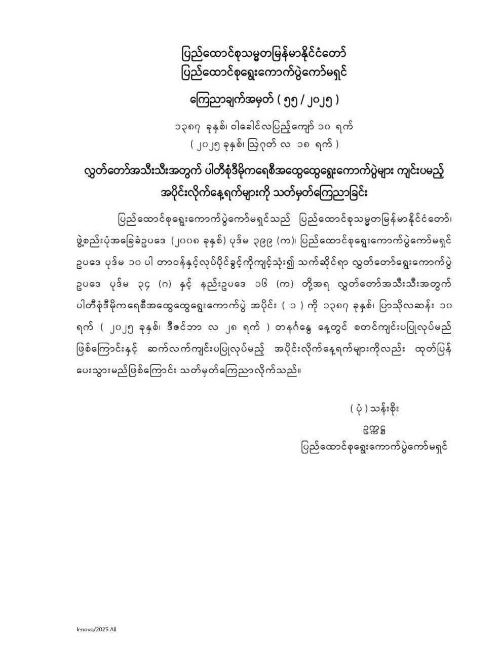 ဒီဇင်ဘာ ၂၈ မှာ ရွေးကောက်ပွဲစလုပ်မယ်လို့ UEC ကြေညာ