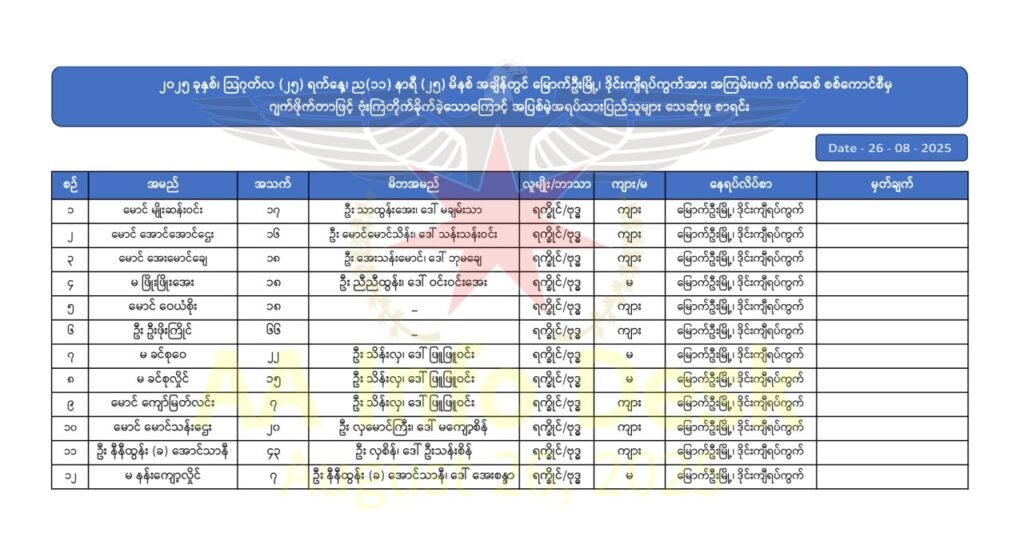 မြောက်ဦးမြို့၊ ဒိုင်းကျီရပ်ကွက်ကို သြဂုတ်လ ၂၅ ရက်၊ည ၁၁ နာရီ၊ ၂၅ မိနစ်အချိန်ကစစ်ကော်မရှင်တပ်လေကြောင်းတိုက်ခိုက်လို့ အရပ်သားဆယ့်နှစ်ဦးသေဆုံးပြီး နှစ်ဆယ်ဦးဒဏ်ရာရသွားတယ်လို့ အာရက္ခတပ်တော်(AA)က သတင်းထုတ်ပြန်ပါတယ်။