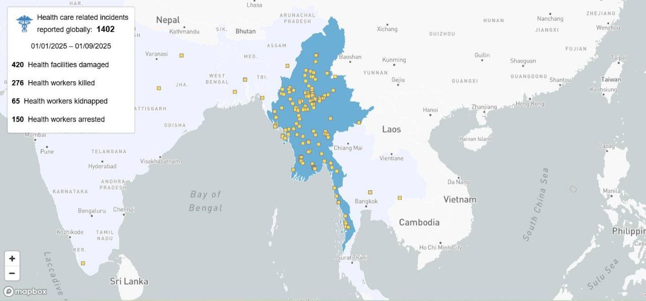 မြန်မာနိုင်ငံမှာ ၂၀၂၅ ခုနှစ်အတွင်း ခုအချိန်ထိ ကျန်းမာရေးစောင့်ရှောက်မှုတွေအပေါ် တိုက်ခိုက်ခံရမှု သိသိသာ သာမြင့်တက်လာနေတယ်လို့ ကုလသမ ဂ္ဂရဲ့ဂျီနီဗာအခြေစိုက်ကျန်းမာရေးက ဏ္ဍဆိုင်ရာ ပူးပေါင်းဆောင်ရွက်ရေးအ ဖွဲ့ (Health Cluster)က စက်တင်ဘာလ ၁ ရက်၊ဒီနေ့ထုတ်ပြန်ပါတယ်။
