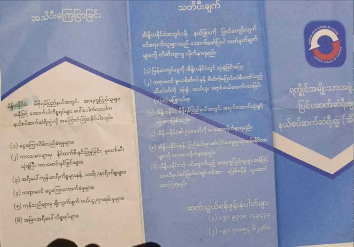 နယ်စပ်ဖြတ်ကျော်သွားလာသူတွေနေနဲ့ ငွေကြွေးလိမ်လည်ခံရတာတွေ၊ကားသ မားတွေက နိုင်ထက်စီးနင်းပြုလုပ်တာတွေ၊မူးယစ်ဆေးဝါးသုံးစွဲလို့ ကားမောင်းတာတွေ၊အရေးပေါ်ကိစ္စတွေနဲ့ သာရေးနာရေးကိစွတွေ၊တရားမဝင်ငွေကြေးကောက်ခံမှုတွေ၊ကုန်သည်တွေဆီမှစျေးကွက်ဖျက်ဝယ်ယူငှားရမ်းတာတွေအပါအဝင် တခြားအရေးပေါ်ကိစ္စတွေဖြစ်လာရင် ရက္ခိုင်အမျိုးသားအဖွဲ့ချုပ်ရဲ့ပြင်ပဆက်ဆံရေးဗျူရို၊အိန္ဒိယနယ်စပ်ဆက်ဆံရေးရုံးကို အကြောင်းကြားနိုင်တယ် အသိပေးထားပါတယ်။