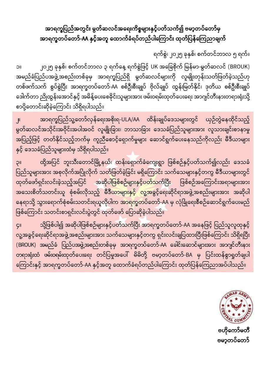 မွတ်ဆလင်အရေးမှာအာရက္ခတပ်တော် (AA)နဲ့အတူ ထောက်ခံရပ်တည်တယ်လို့ ဗမာ့တပ်တော်(BAMAR ARMY)ကစက်တင်ဘာလ ၅ ရက်၊ဒီနေ့ထုတ်ပြန်ပါတယ်။