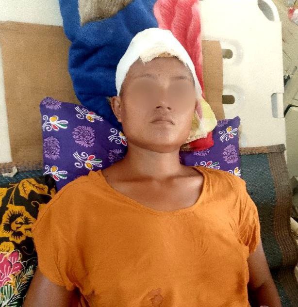 မြောက်ဦးမြို့၊ဒိုင်းကျီရပ်ကွက်မှ အသက်သုံးဆယ်အရွယ်ဒေါ် ခင်အေးရီမှာလေကြောင်းတိုက်ခိုက်ခံရတဲ့နေ့က ဦးခေါင်းမှာ ဒဏ်ရာပြင်းပြင်းထန်ထန်ရသွားခဲ့လို့ အရေးပေါ်ဆေးကုသမှုခံယူနေရတာပါ။