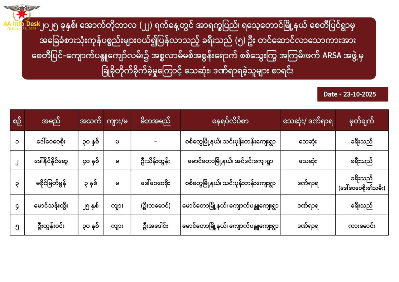 အဲဒီမောင်တောမြို့နယ်၊ ကျောက်ပန္ဒူကျေးရွာနေ အသက်သုံးဆယ်အရွယ်မဝေဝေစိုးနဲ့ အသက်လေးဆယ်အရွယ်မနိုင်နိုင်ဆွေကို အကြမ်းဖက်သမားတွေပစ်သတ်သွားကြတာပါ။