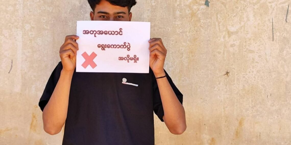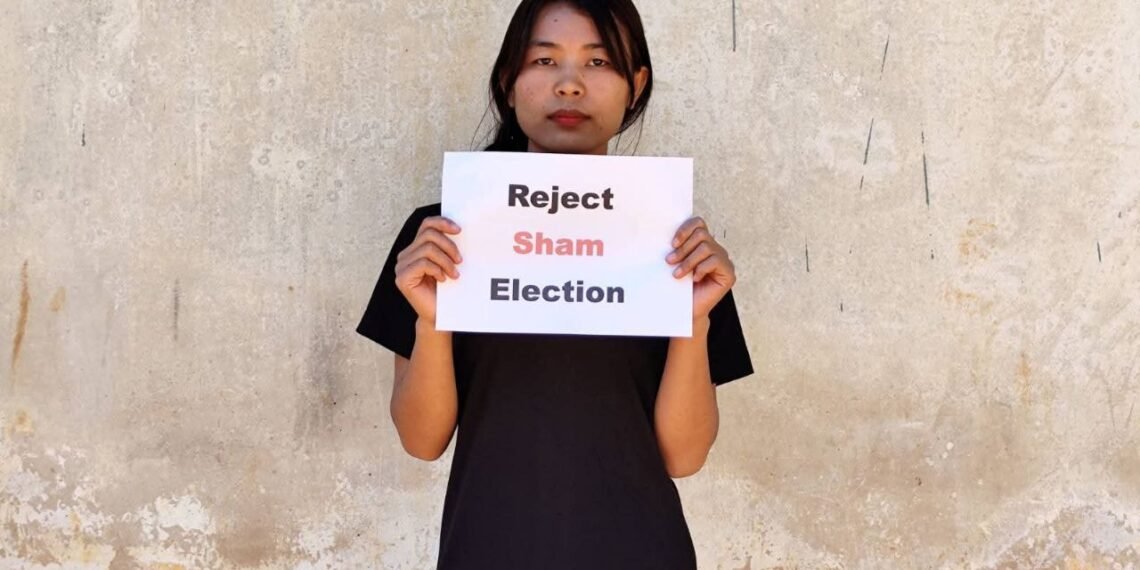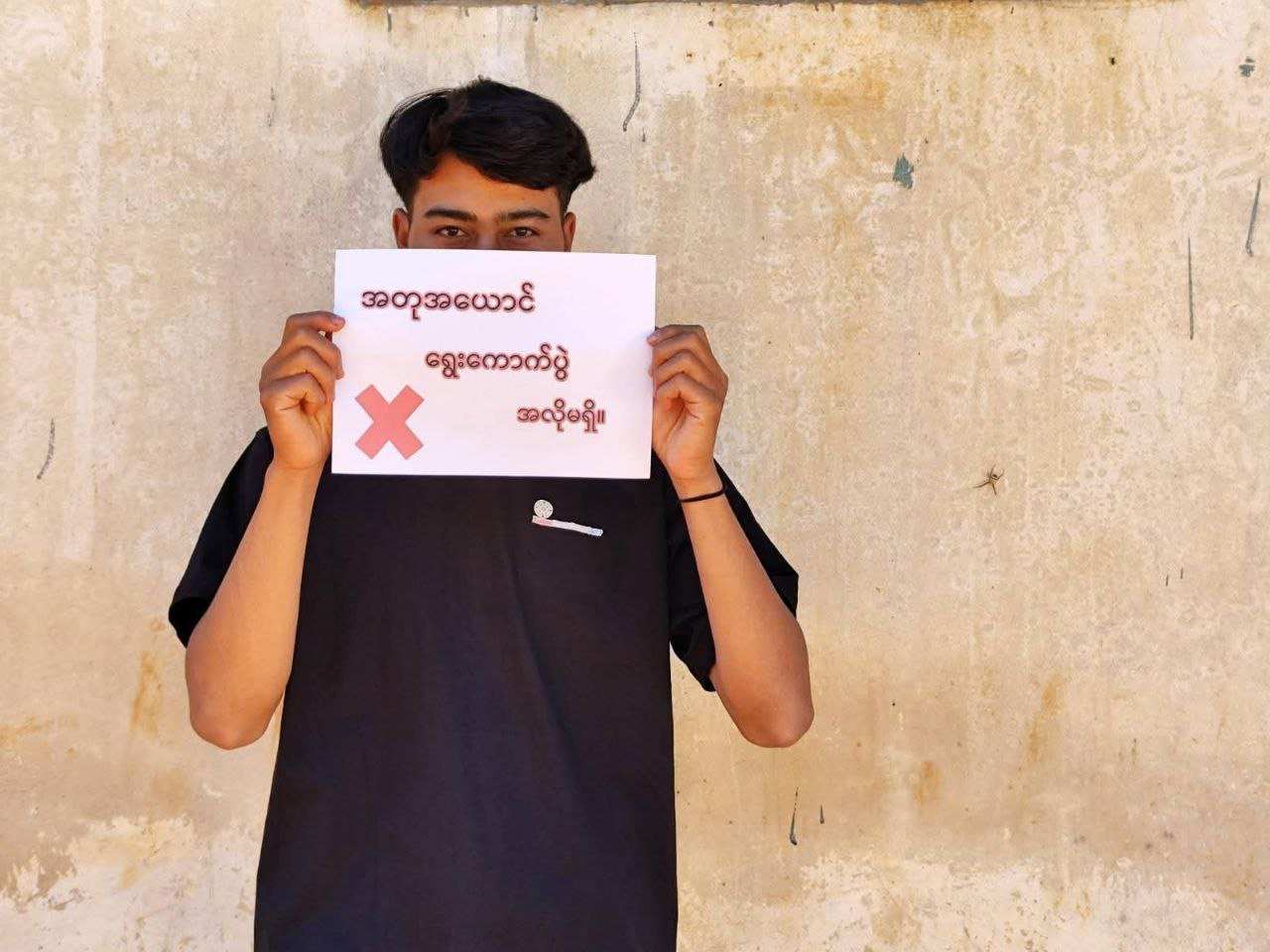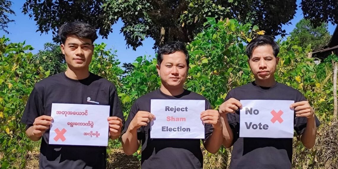 “လူထုဆန္ဒမပါဝင်တဲ့ ရွေးကောက်ပွဲလုံးဝ အလိုမရှ်ိ၊သင့်မဲနဲ့ လူသတ်ခွင့်မပေးပါနဲ့၊”Our Voice” ”Our Rights” ”Our Fight”ငါတို့အသံငါတို့ အခွင့်အရေး ငါတို့တိုက်ပွဲ၊ အာဏာရှင်မှန်သမျှ ကျဆုံးရမယ်’ဆိုပြီး ကန့်ကွတ်ထားပါတယ်။