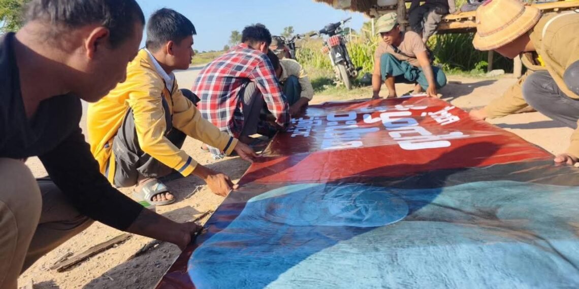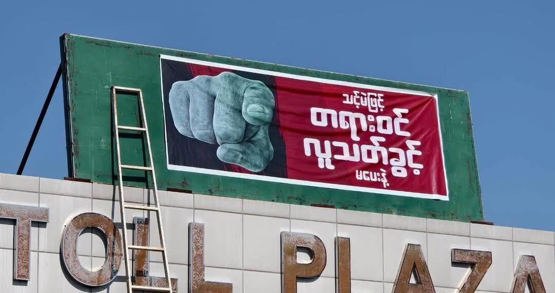 စစ်ကော်မရှင်တပ်ရဲ့ အတုအယောင်ရွေးကောက်ပွဲကို လက်မခံဆန့်ကျင်ကြောင်းပြသတဲ့အနေနဲ့ “သင့်မဲဖြင့်တရားဝင်လူသတ်ခွင့်မပေးနဲ့” စာသားပါ ဆိုင်းဘုတ်တချို့ကို စိုက်ထူနေကြတာပါ။