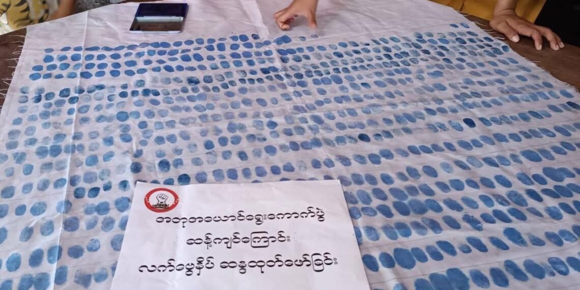 စစ်ကိုင်းတိုင်း၊ ရွေဘိုမြို့နယ်မှာ စစ်ကော်မရှင်တပ်ပြုလုပ်မယ့် ရွေးကောက်ပွဲကိုလက်မခံကြောင်း လက်ဗွေနှိပ်ဆန္ဒပြခဲ့ကြတယ်လို့ ရွှေဘိုမြို့နယ်သပိတ်အင်အားစုက ဒီဇင်ဘာလ ၂၅ ရက်၊ မနေ့ကထုတ်ပြန်ပါတယ်။