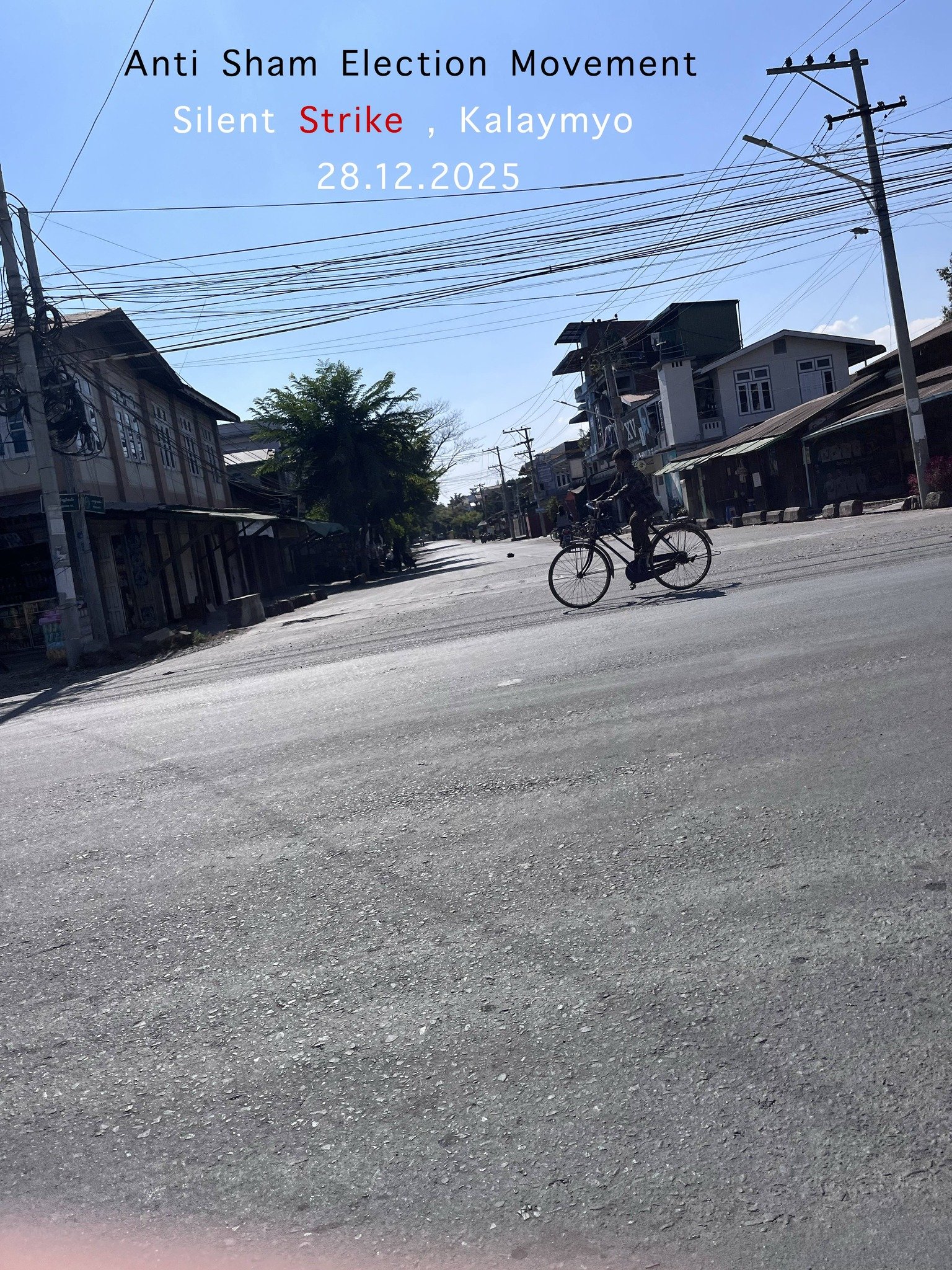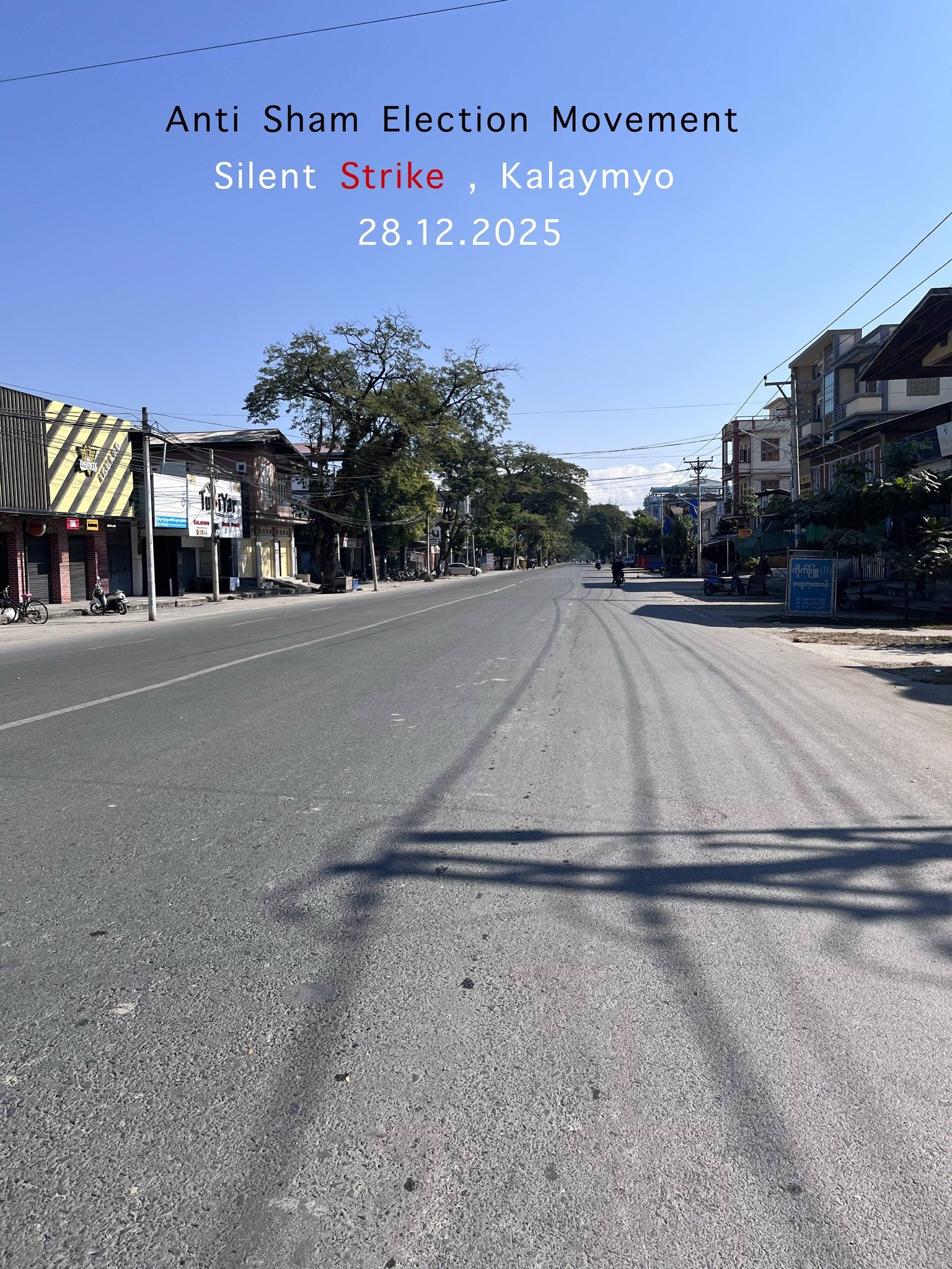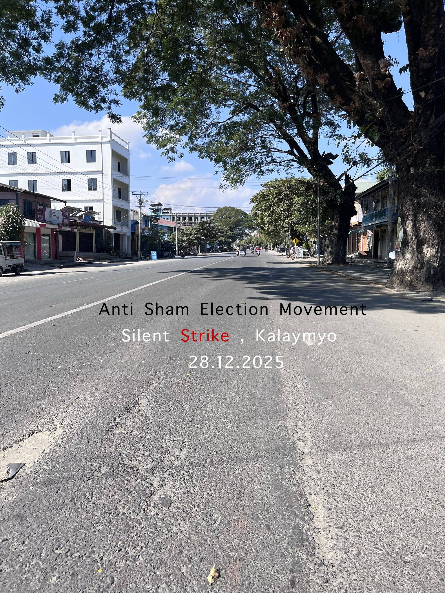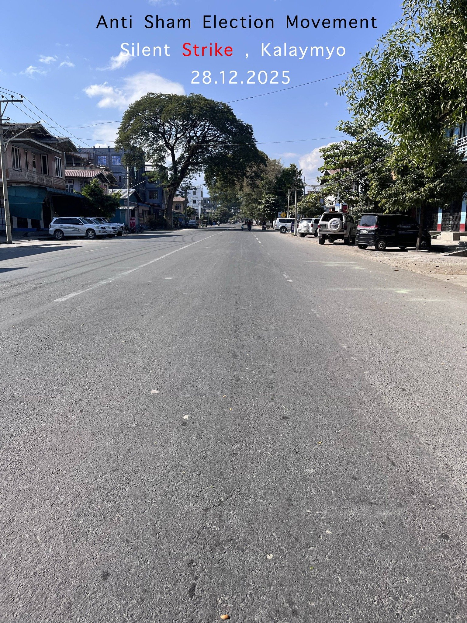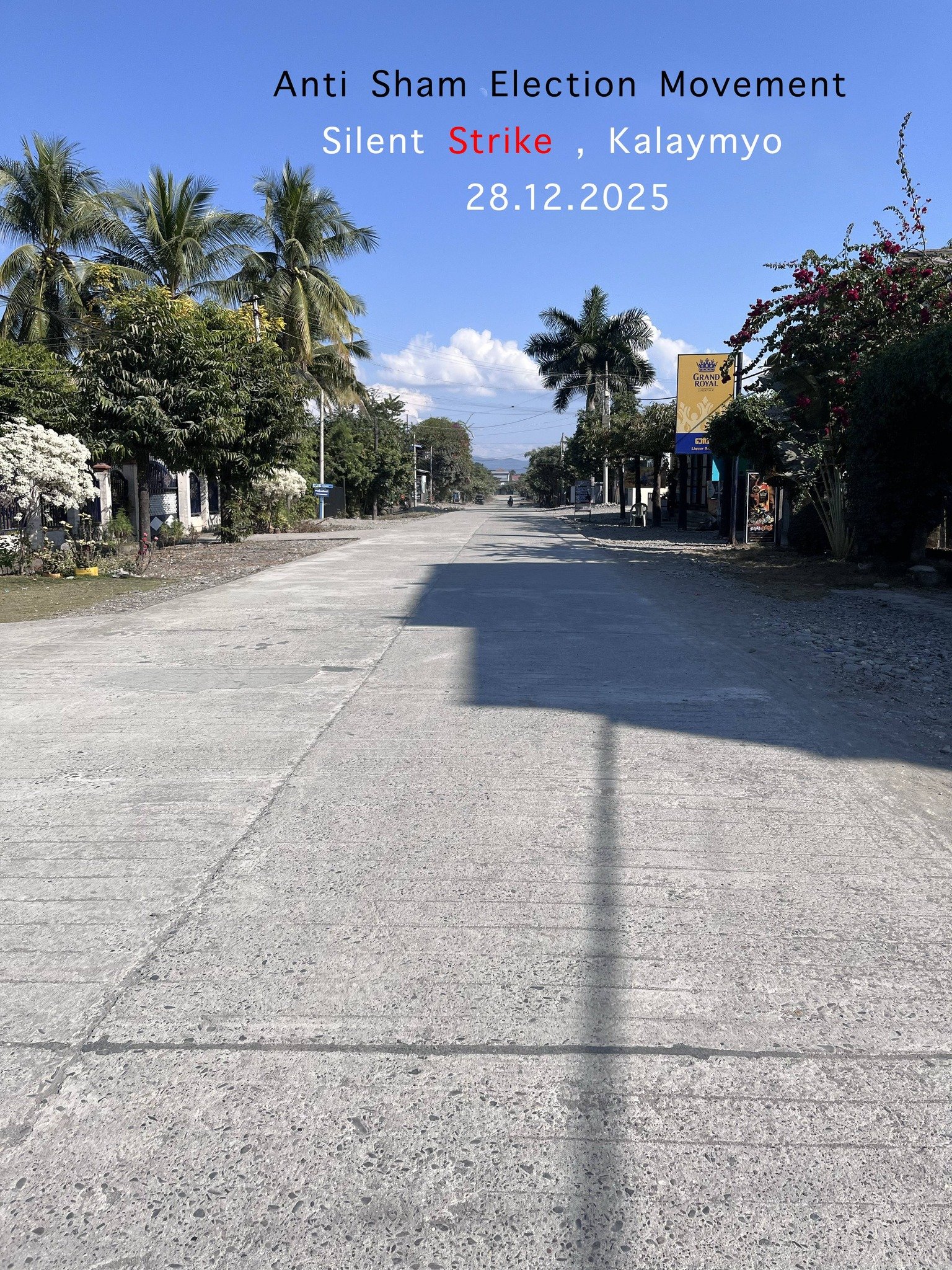 ကလေးမြို့ လမ်းမကြီးမြင်ကွင်းတွေမှာ ဒေသခံပြည်သူတရပ်လုံးရဲ့ ဒီဇင်ဘာလ ၂၈ ရက်၊ ဒီနေ့မှာ ရွေးကောက်ပွဲ ဆန့်ကျင်ရေး “အပြင်မထွက်သပိတ်” ပြုလုပ်နေကြတယ်လို့ဆိုပါတယ်။