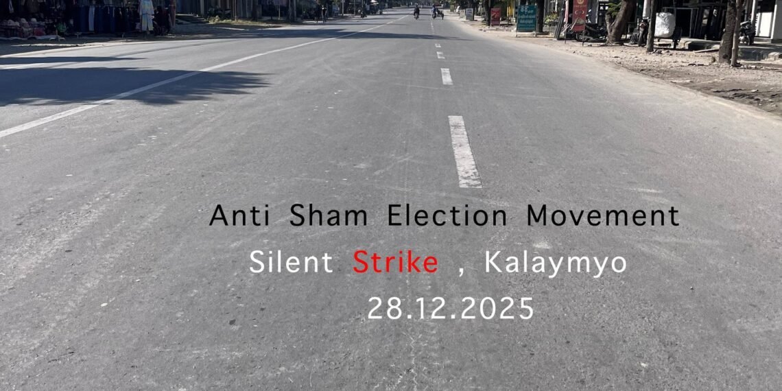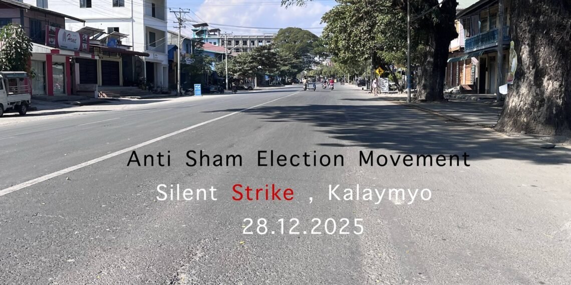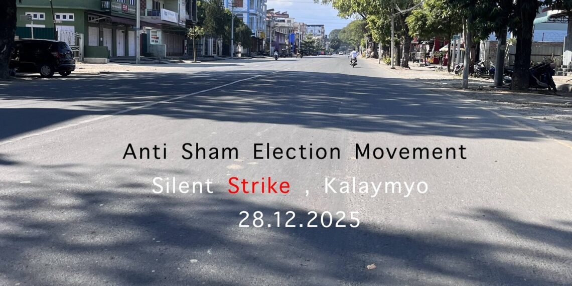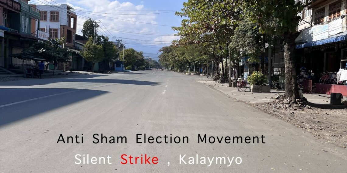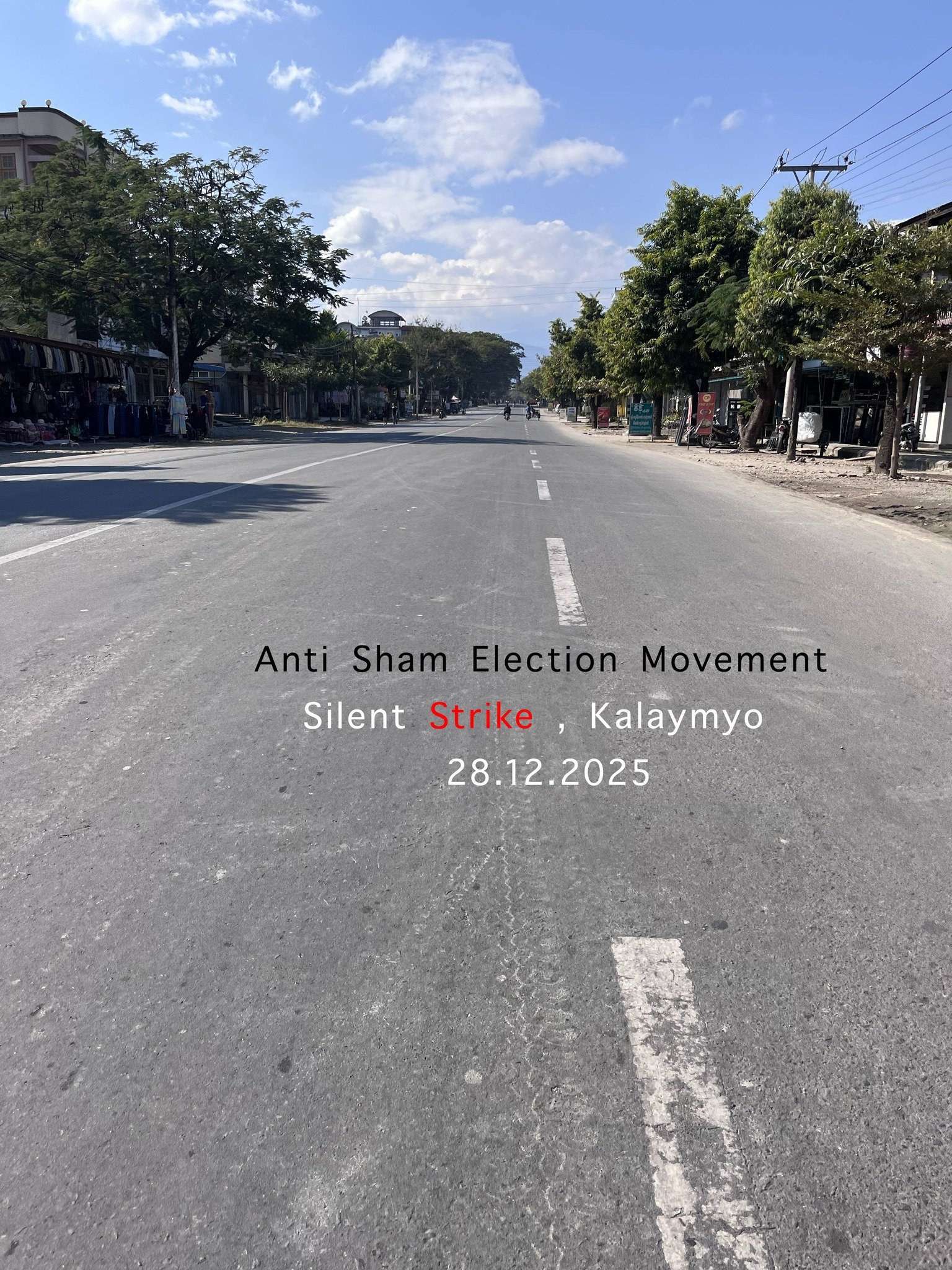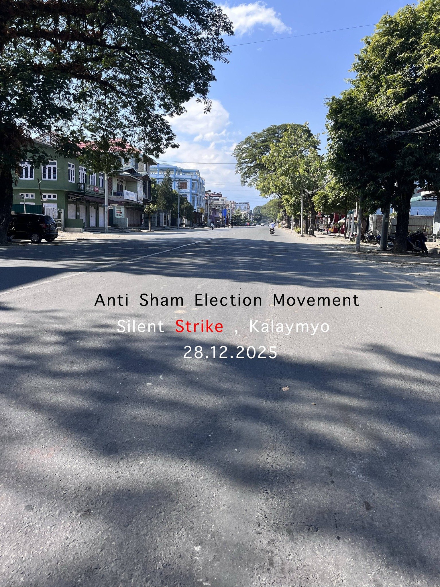 ကလေးမြို့ လမ်းမကြီးမြင်ကွင်းတွေမှာ ဒေသခံပြည်သူတရပ်လုံးရဲ့ ဒီဇင်ဘာလ ၂၈ ရက်၊ ဒီနေ့မှာ ရွေးကောက်ပွဲ ဆန့်ကျင်ရေး “အပြင်မထွက်သပိတ်” ပြုလုပ်နေကြတယ်လို့ဆိုပါတယ်။